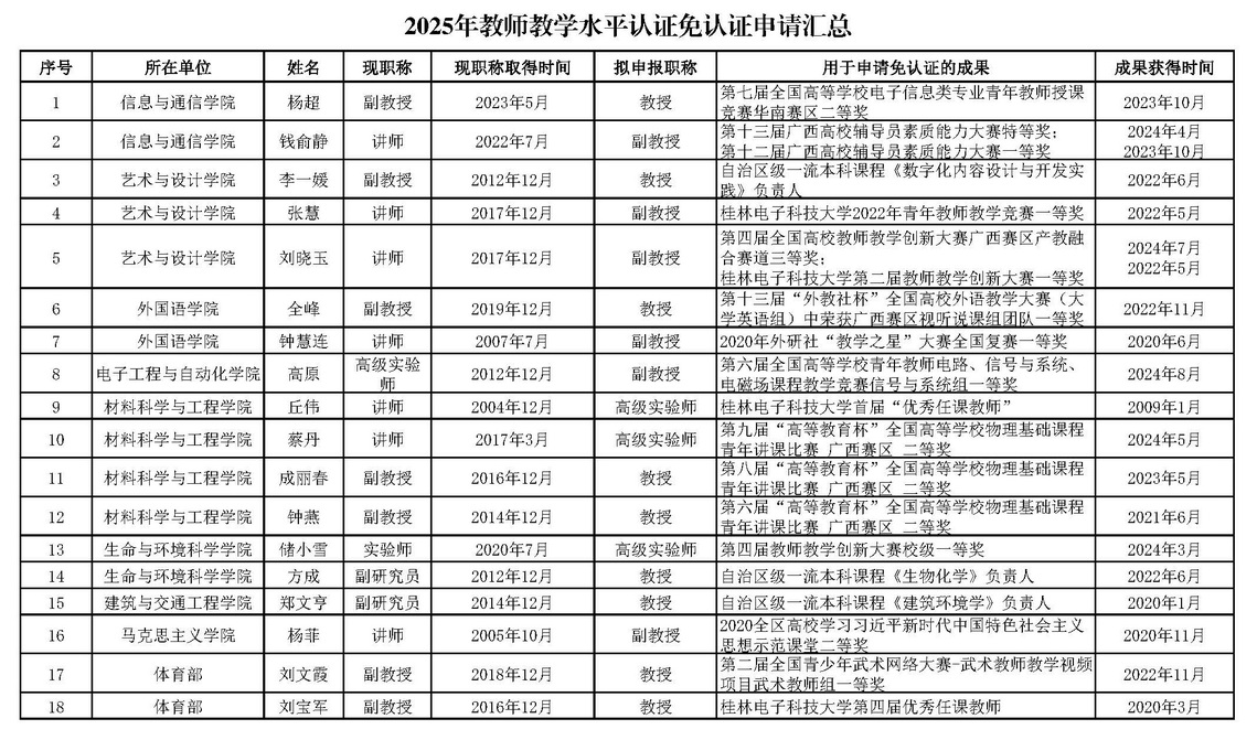 根据2025年教师教学水平免认证工作要求,现将本学期教师申请进行公示,公示期为三个工作日,4月15日至4月17日止。公示期内如有异议,请以书面形式,并署真实姓名和单位,逾期及匿名反映不予受理。