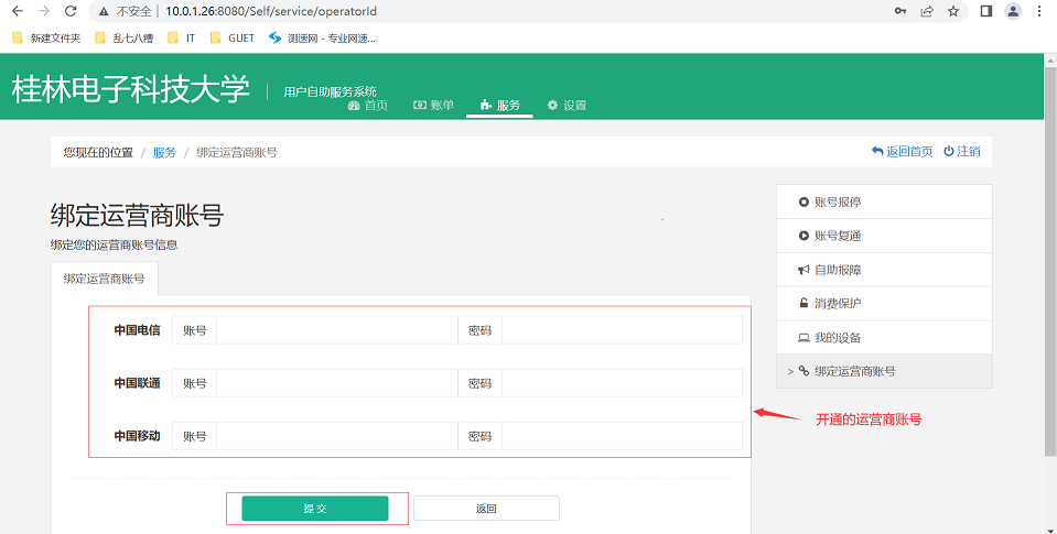 得到正确的IP地址之后,打开上网登录页10.0.1.5,绑定运营商账号和无线网络一样,具体操作见上.