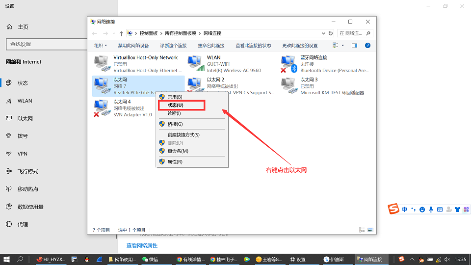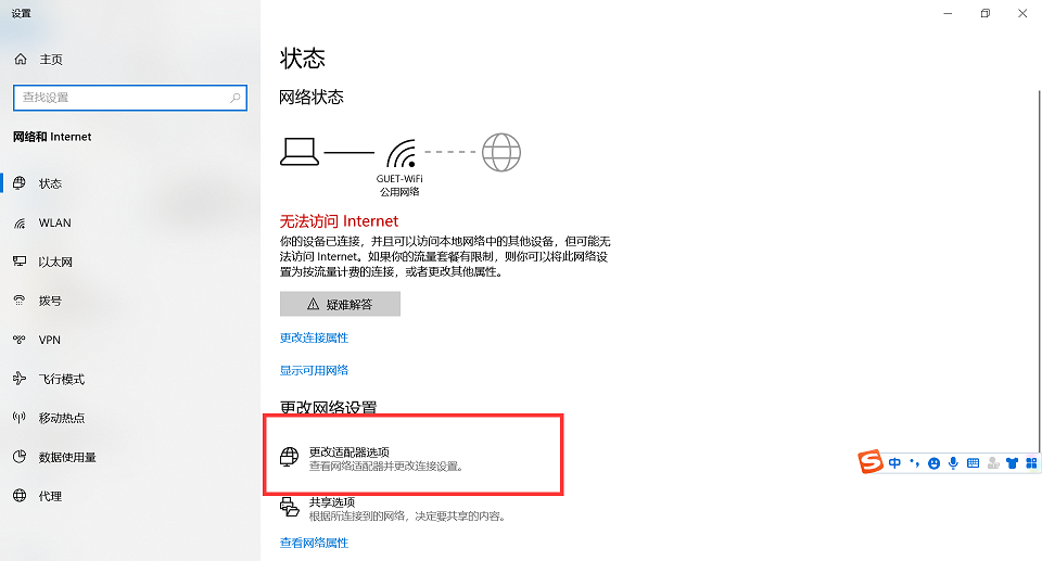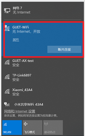 鼠标左键点击电脑右下角网络连接小图标,然后点击下图网络和Internet设置