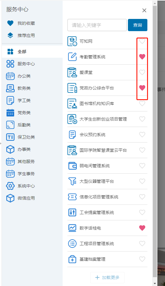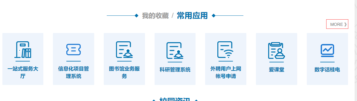 常用应用:比较常用的热门应用系统会自动展示在“常用应用”,点击more便可进入门户服务中心,如图所示。