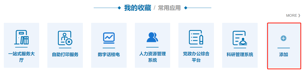 我的收藏:添加自己使用频繁应用,便于快速进入,点击“我的收藏”下的添加,在弹出的页面中点击应用后面的“
