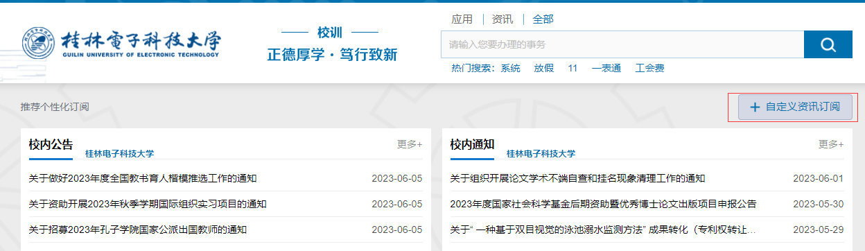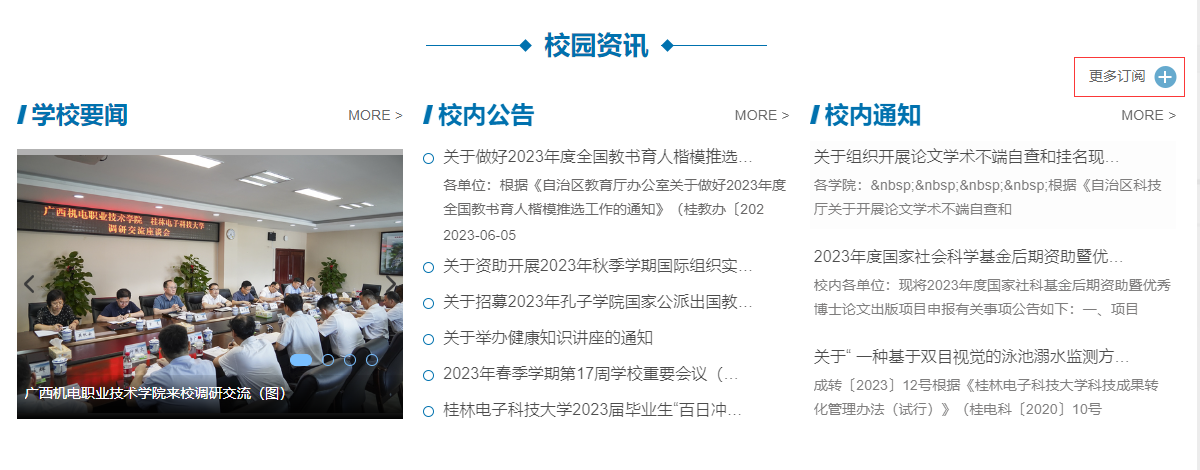 查看学校资讯,点击后面的“更多订阅+“进入资讯中心对资讯进行订阅操作。点击每个栏目后面的more进入栏目列表页查看很多的资讯。