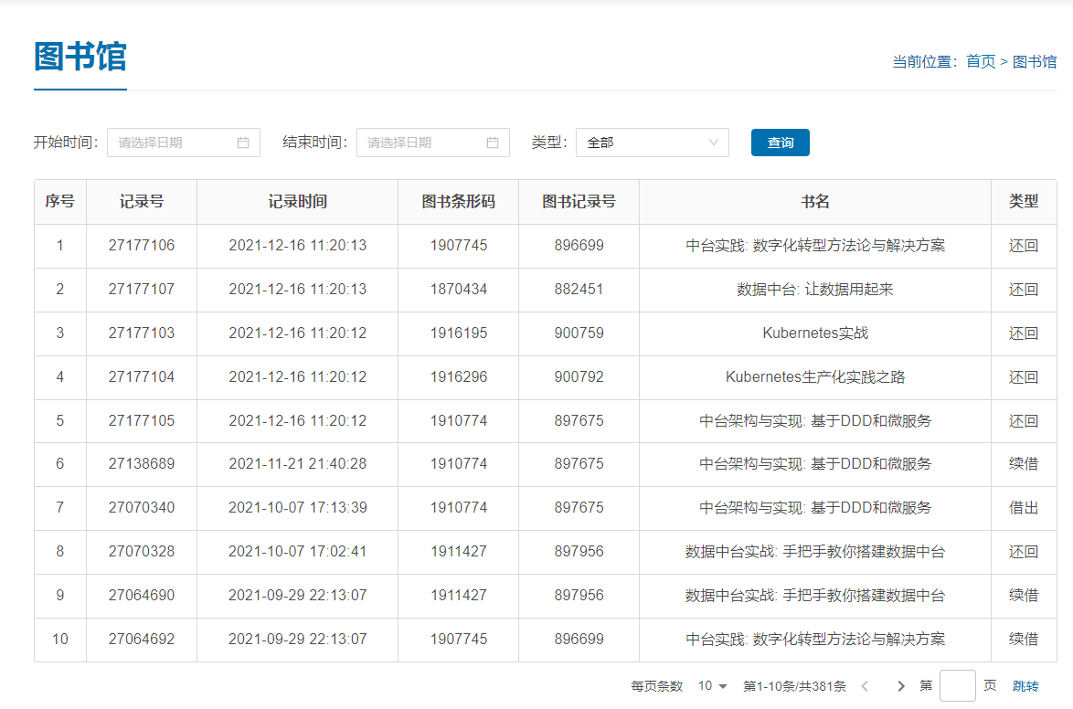 图书借阅:三亿官方官网三亿(中国)_三亿(中国)展示未还图书的数量,进入后展示详细的图书借阅记录,并可根据借阅时间、类型查询借阅记录。