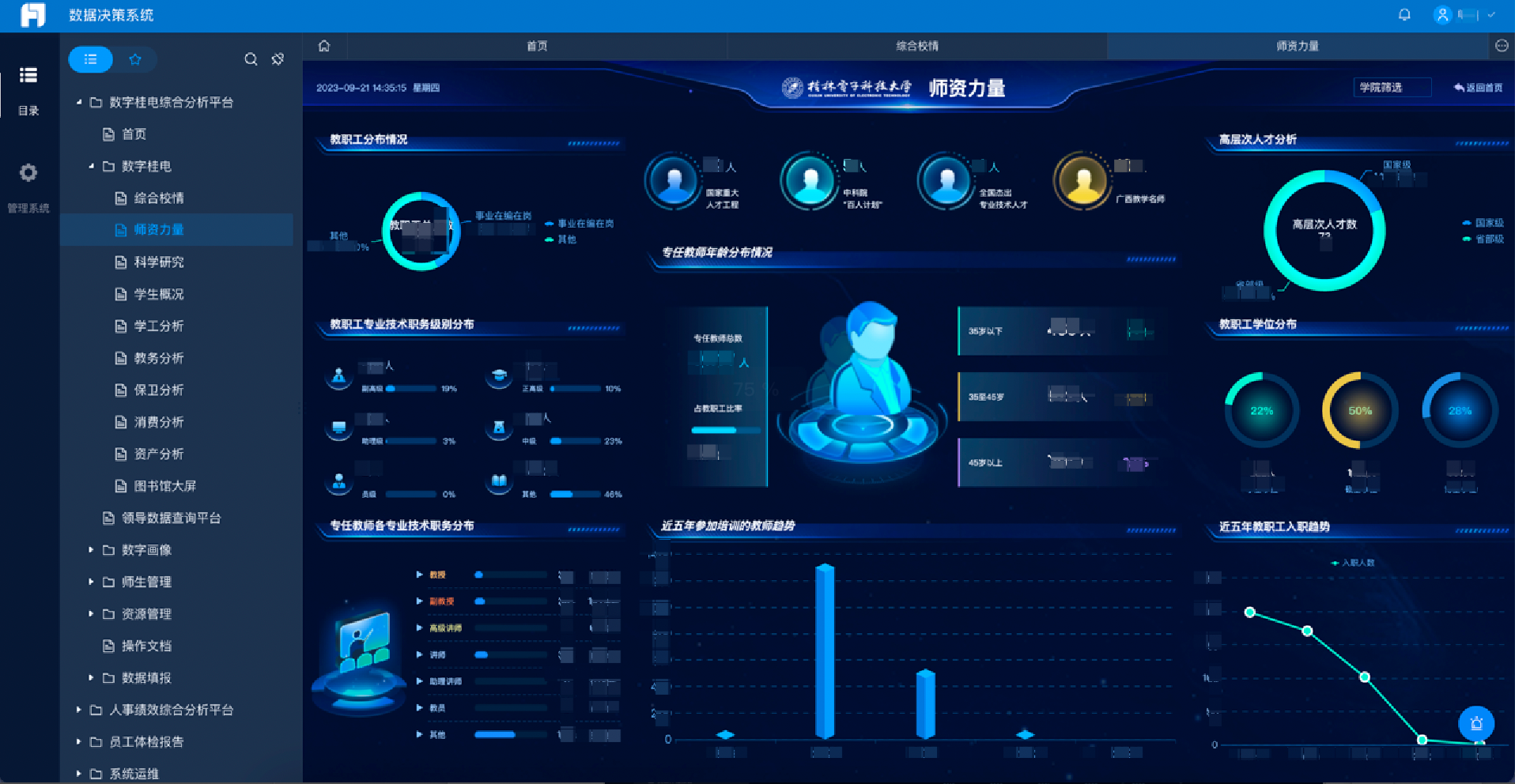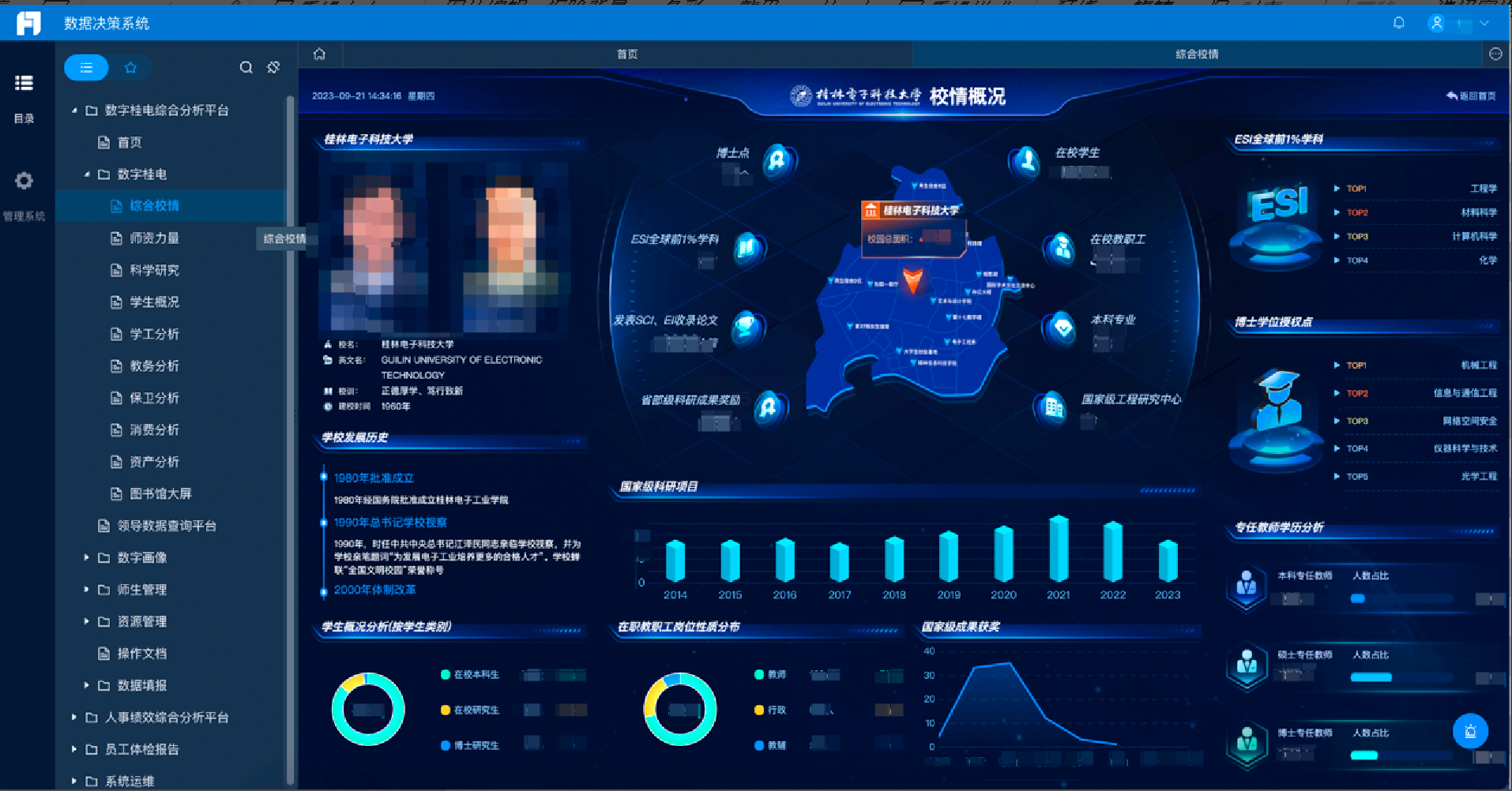 数字桂电:通过数字高校、数字学工、数字教工、数字教学、数字生活、数字资产等多个业务部门的场景主题分析构建数字桂电,以可视化大屏综合展示了学校校情、师资力量、科学研究、学生概况、学工分析、图书馆分析、教务分析、消费分析、资产分析等;