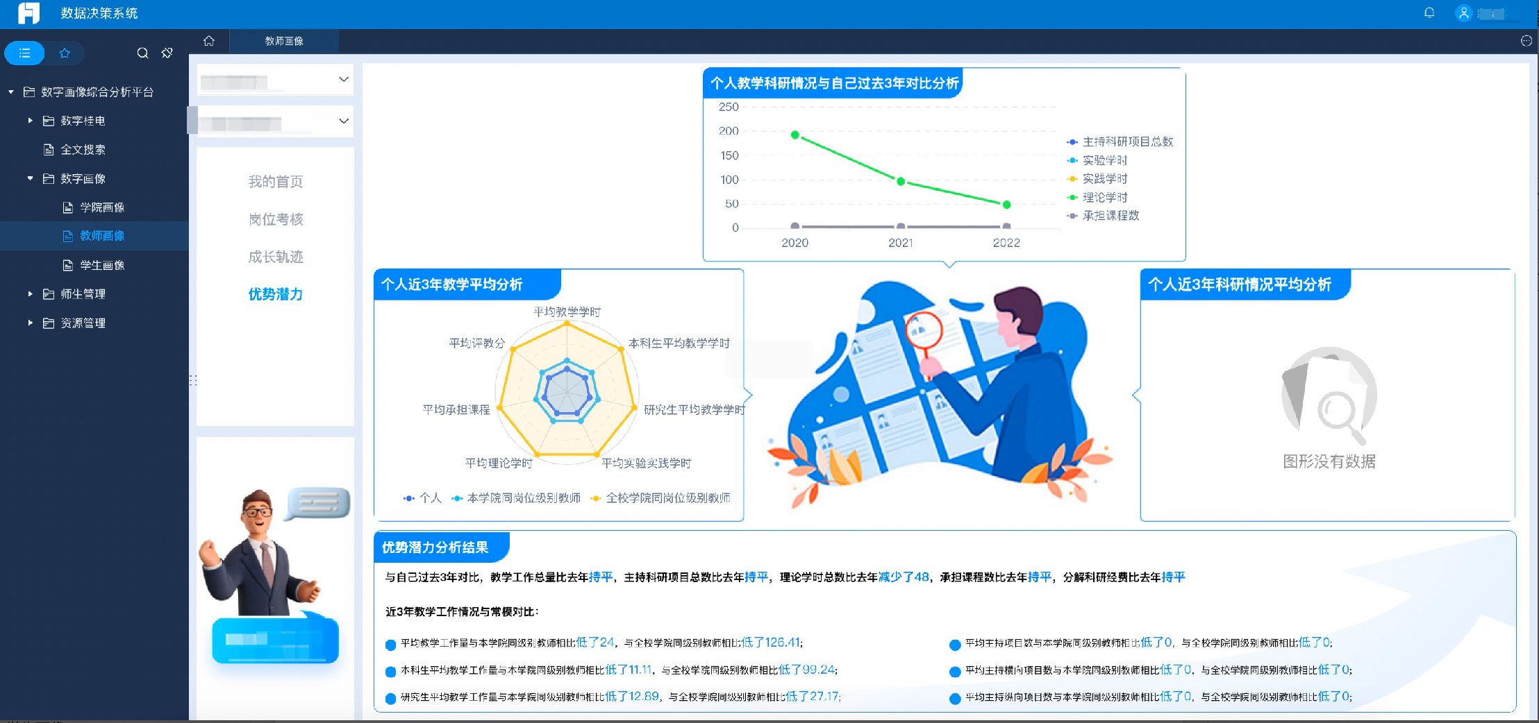 优势潜力展示教师个人教学科研情况与自己过去3年对比分析、个人近3年教学平均分析、个人近3年科研情况平均分析、优势潜力分析结果的信息,点击“优势潜力”页签,进入到教师成长轨迹-优势潜力页面,如下图4.3.2-4-优势潜力。