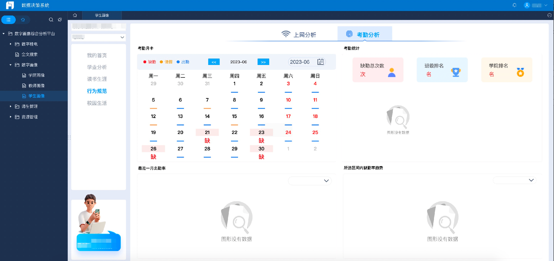 点击“行为规范”围绕学生在学校的日常行为规范进行分析,包含学生的上网行为以及考勤分析,如下图默认展示上网分析,图4.3.3-4上网分析。