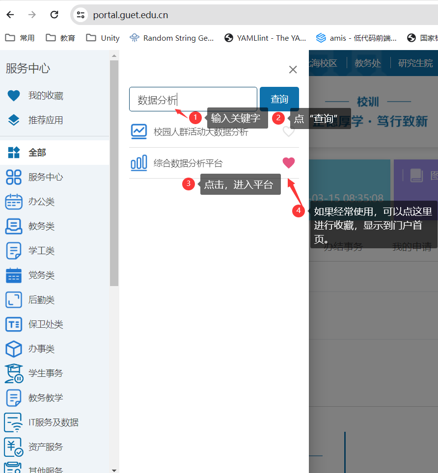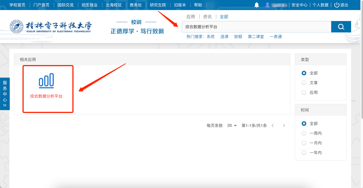 登录智慧校园,在页面上方搜索栏搜索:综合数据分析平台。