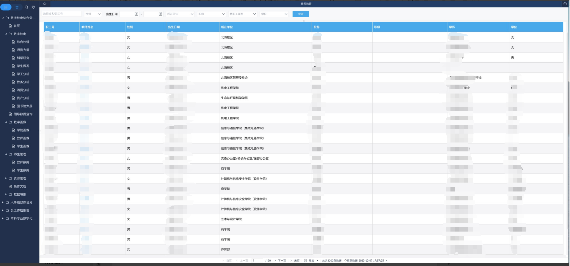 教师数据模块将全校教师进行集中的管理,支持用户查看当前教师的基本信息、教育教学、科学研究、能力提升、育人服务、社会服务等多个维度的明细数据,如下图4.4.1-教师列表。