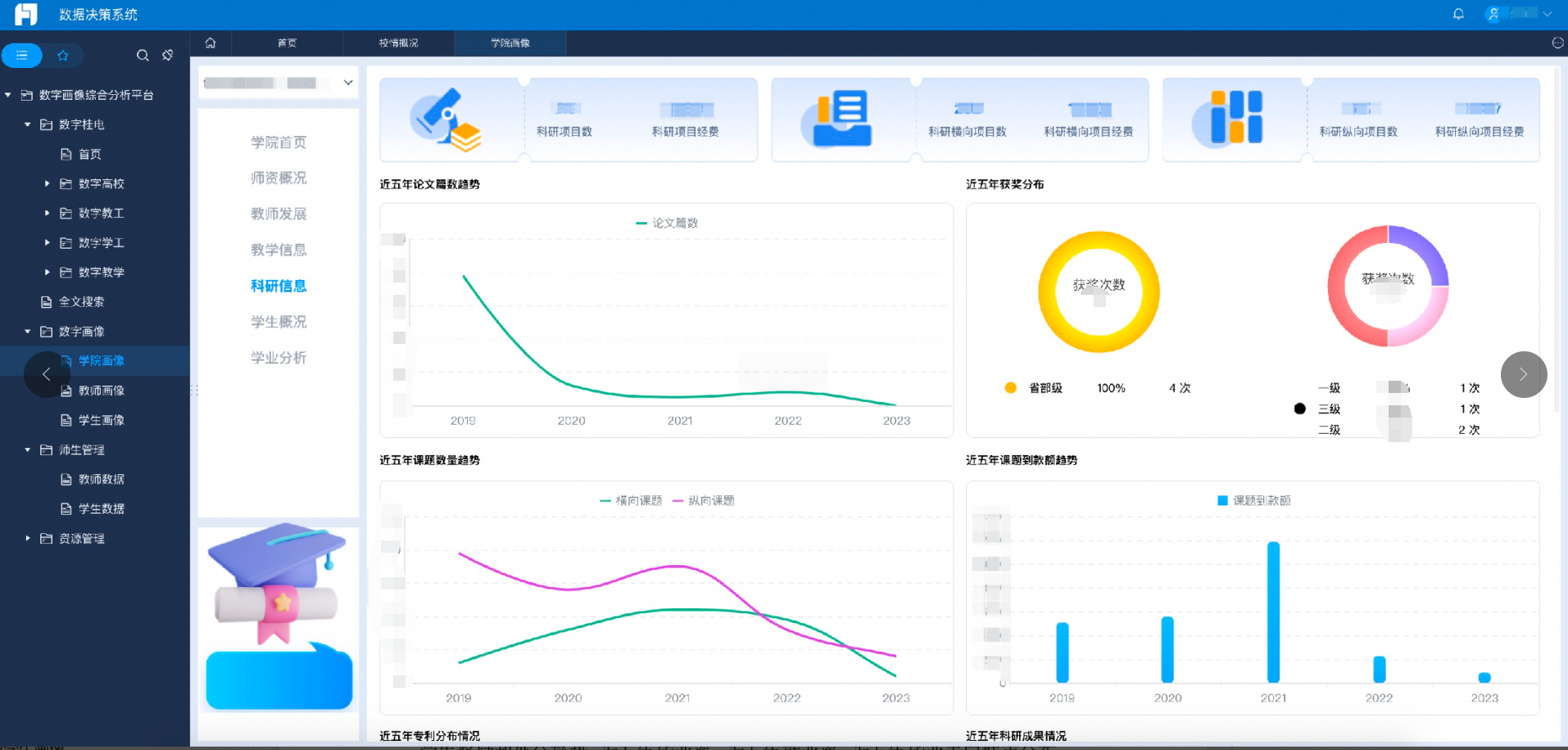 点击“科研信息”查看当前学院围绕科研展开的数据分析,包含科研概况、科研论文趋势、科研获奖、科研项目情况趋势、科研到款趋势、专利分布情况、科研成果情况、预算执行情况等科研分析,如下图4.3.1-5科研信息。