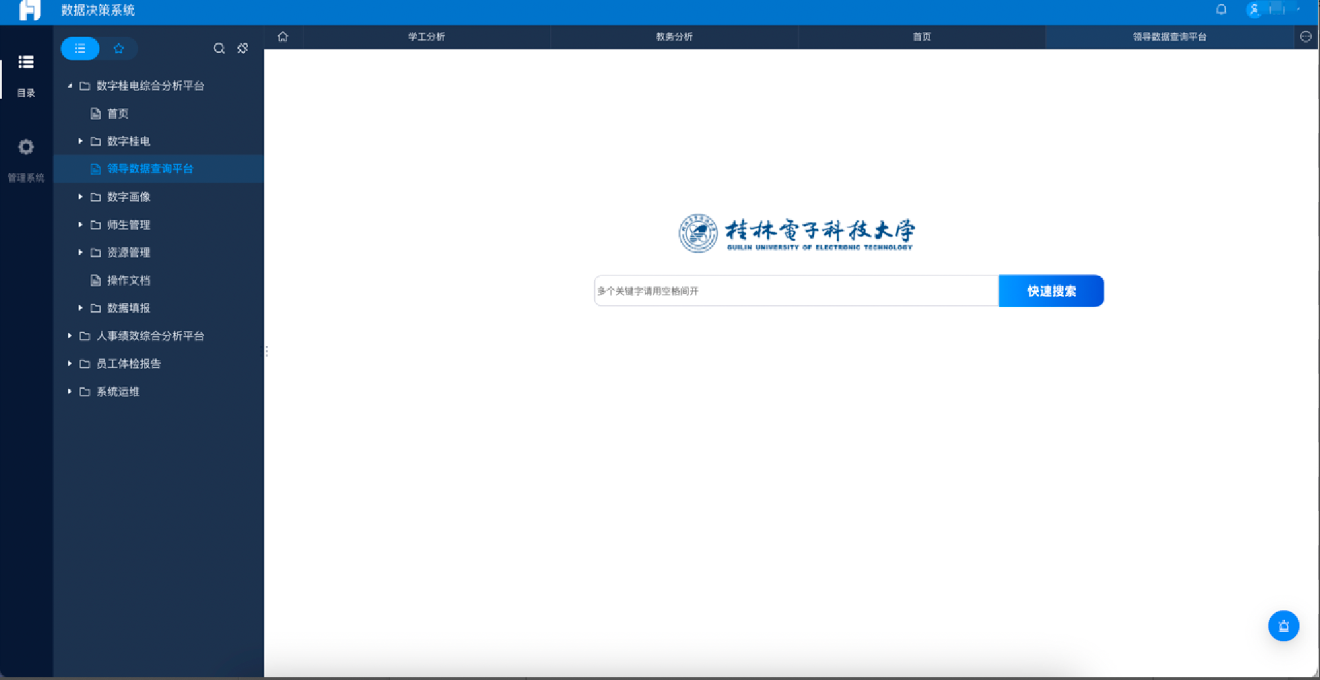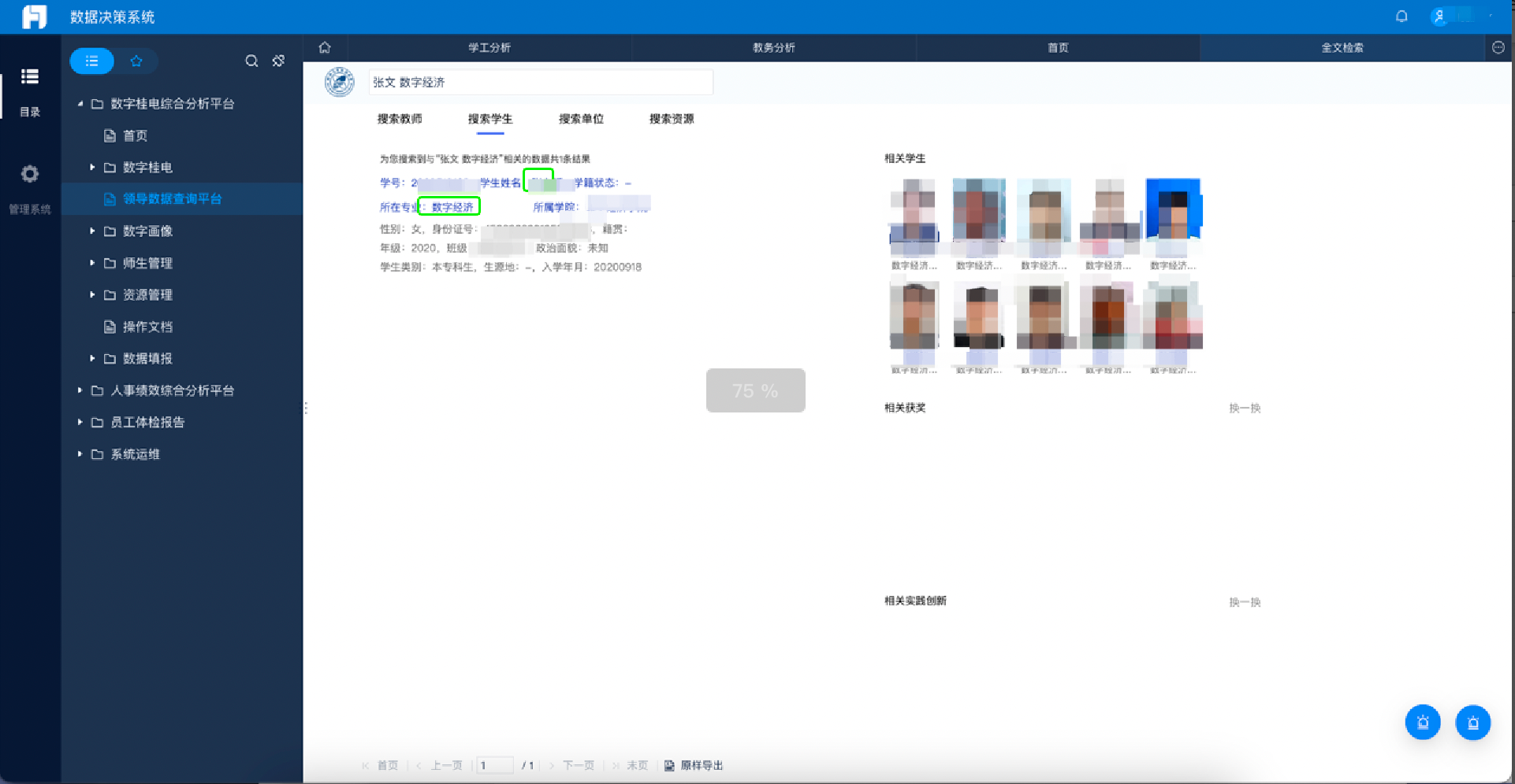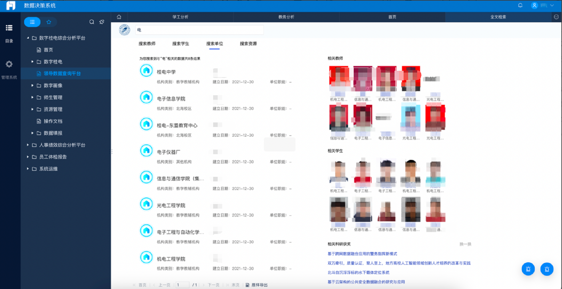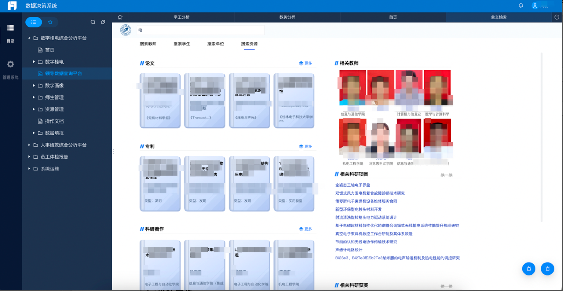 领导数据查询:以全文检索类的方式搜索学校教师、学生、单位、资源,提供学生、教师、单位、科研项目、论文、成果获奖等不同维度的信息数据,并支持用户下钻查询更多的详情;