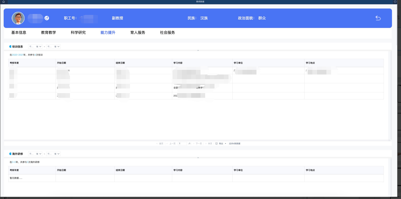 能力提升展示教师的培训信息、海外研修、企业实践等信息,点击“能力提升”页签,进入到教师能力提升页面,如下图4.4.1.4-能力提升。