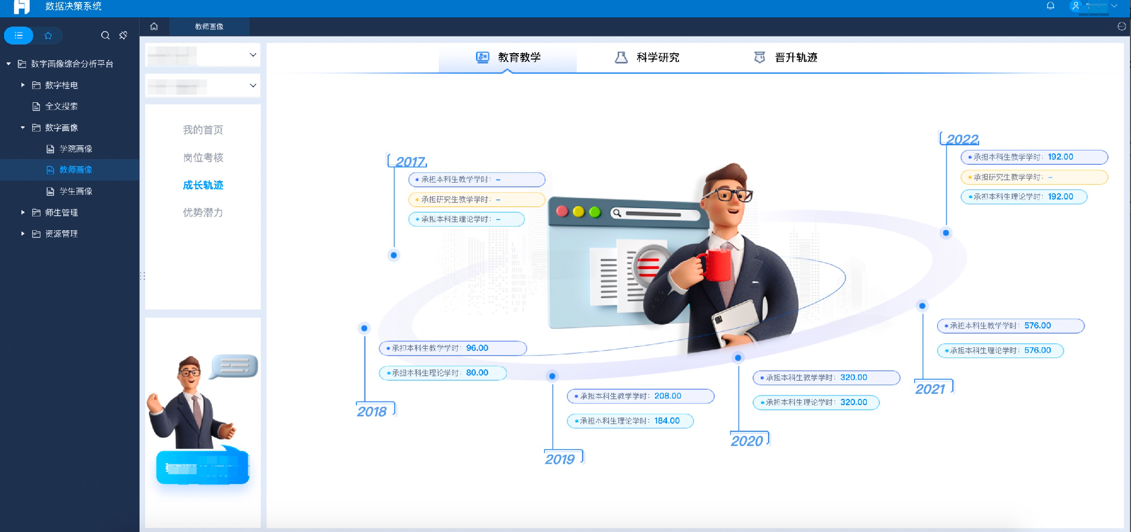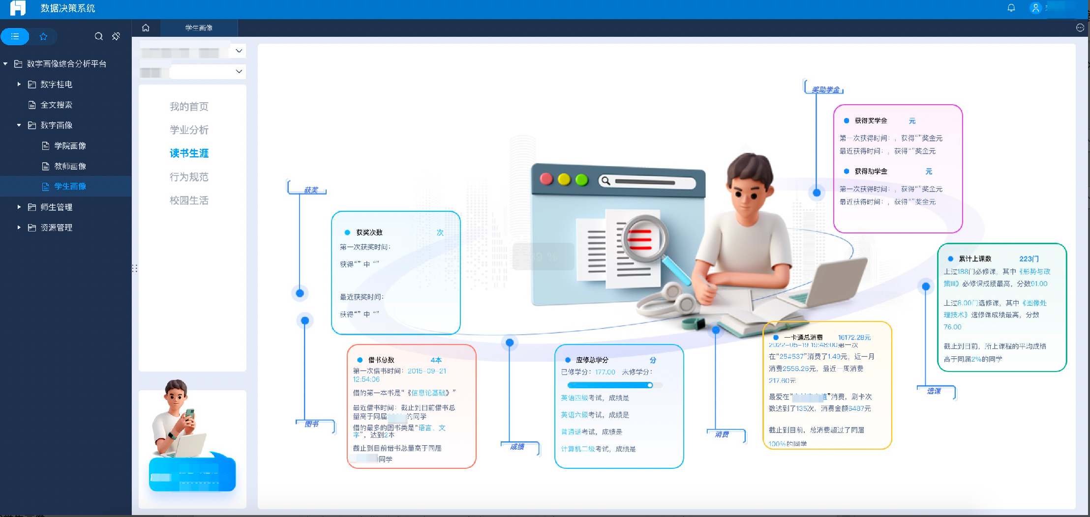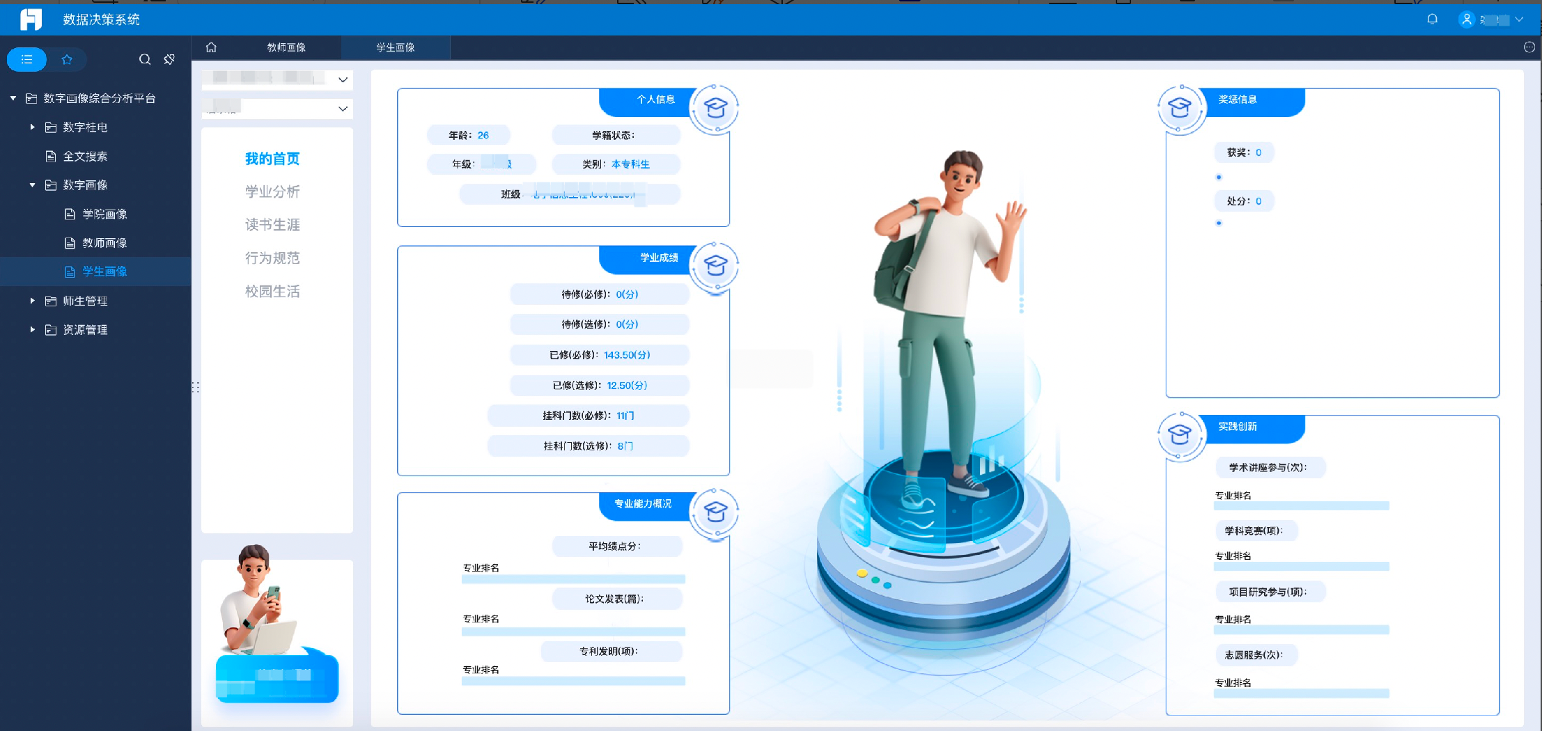 数字画像,将学校的学生、教师、学院等用数字化手段呈现具体的画像。分别展示学生的学业生涯、教师的职业发展、学院的整体教学及学生情况等各类数字画像。