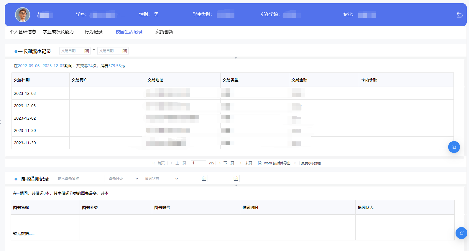 点击“校园生活”进入该学生的校园生活分析页面,包含学生的一卡通消费分析、学生图书借阅分析、学生在校内的轨迹分析,如下图4.3.3-6校园生活。