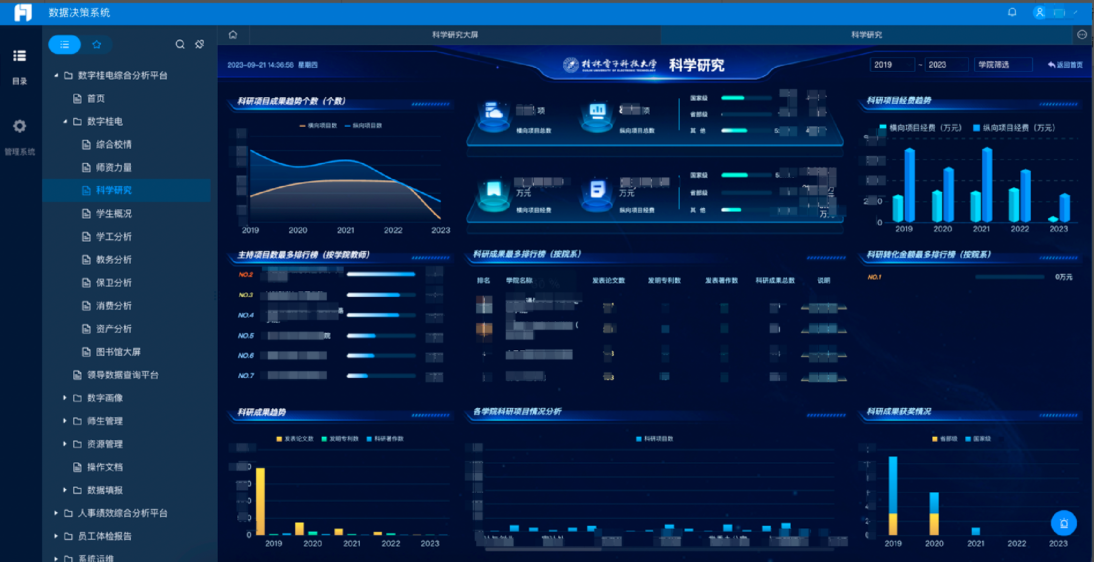科学研究围绕学校的科研能力展开分析,包含学校科研项目趋势、学校科研成果趋势、科研项目经费情况、科研转化排行榜、科研成果获奖情况、各学院科研项目情况等科研分析,详见下图4.1.4-1科学研究。