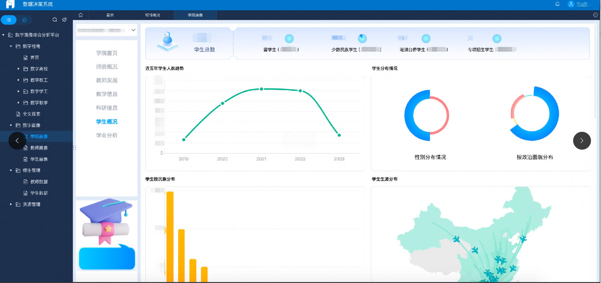 点击“学生概况”展示当前学院围绕学生的基本概况分析,包含学生概况、近五年学生人数趋势、学生分布情况、学生按民族分布、学生生源分布、近五年学生奖励和处分趋势、近五年毕业率、近五年就业率、近五年毕业去向城市分布。如下图4.3.1-6学生概况。