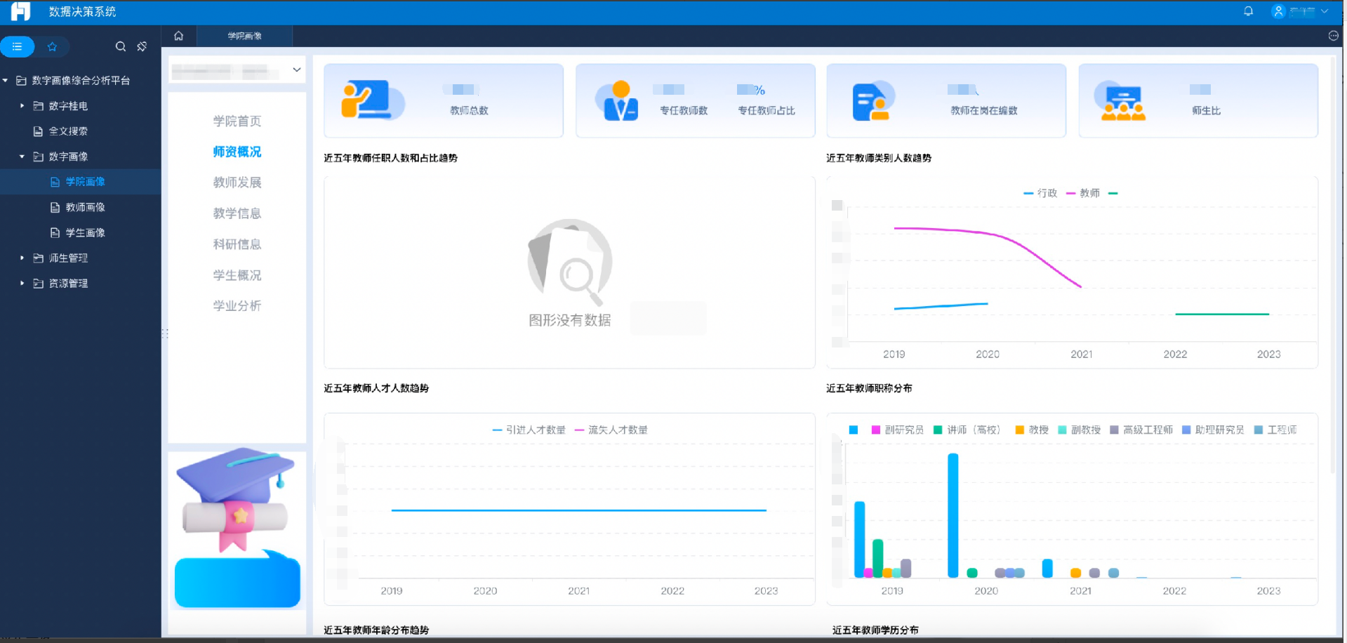 点击“师资概况”展示当前学院围绕师资概况的介绍,包含教师概况、专任教师占比、教师类别人数趋势、教师人才趋势、教师职称分布、教师年龄分布、教师学历分布等数据分析,如下图4.3.1-2师资概况。