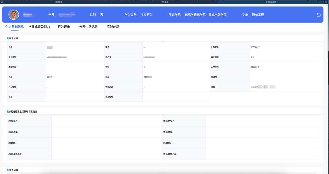 个人基础信息展示学生的个人基本信息、所属班级班主任及辅导员信息、竞赛获奖信息,点击学生列表中的姓名,进入到学生个人基础信息页面,如下图4.4.2.1-基本信息。