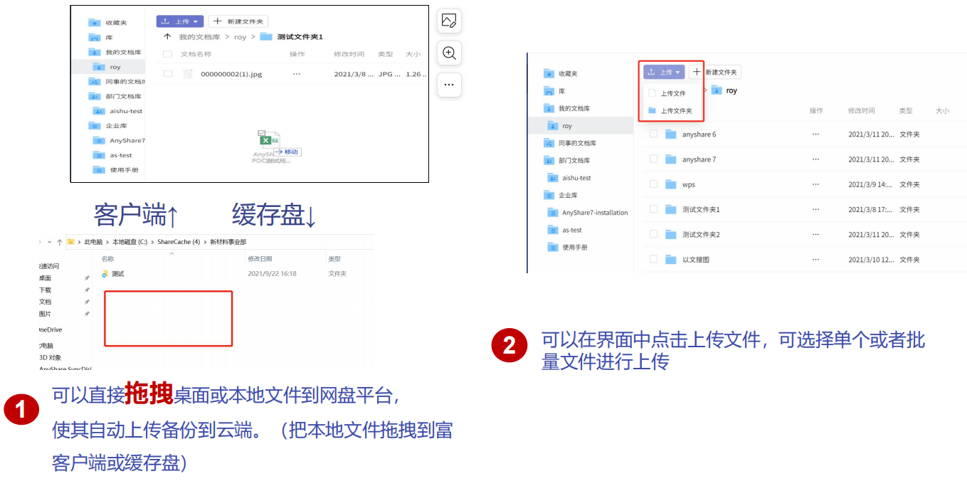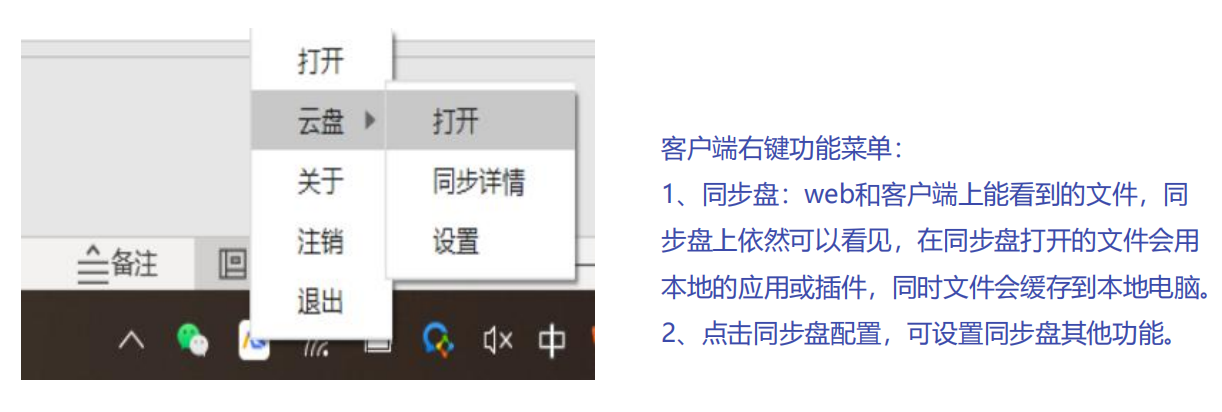 同步盘:在本地盘建立相同文件目录,点击界面中图标后会自动打开本地目录,进行文件上传,编辑,文件夹创建等操作。并且在离线时查看/编辑已缓存的文件,会在下次上线时与线上版本进行匹配。