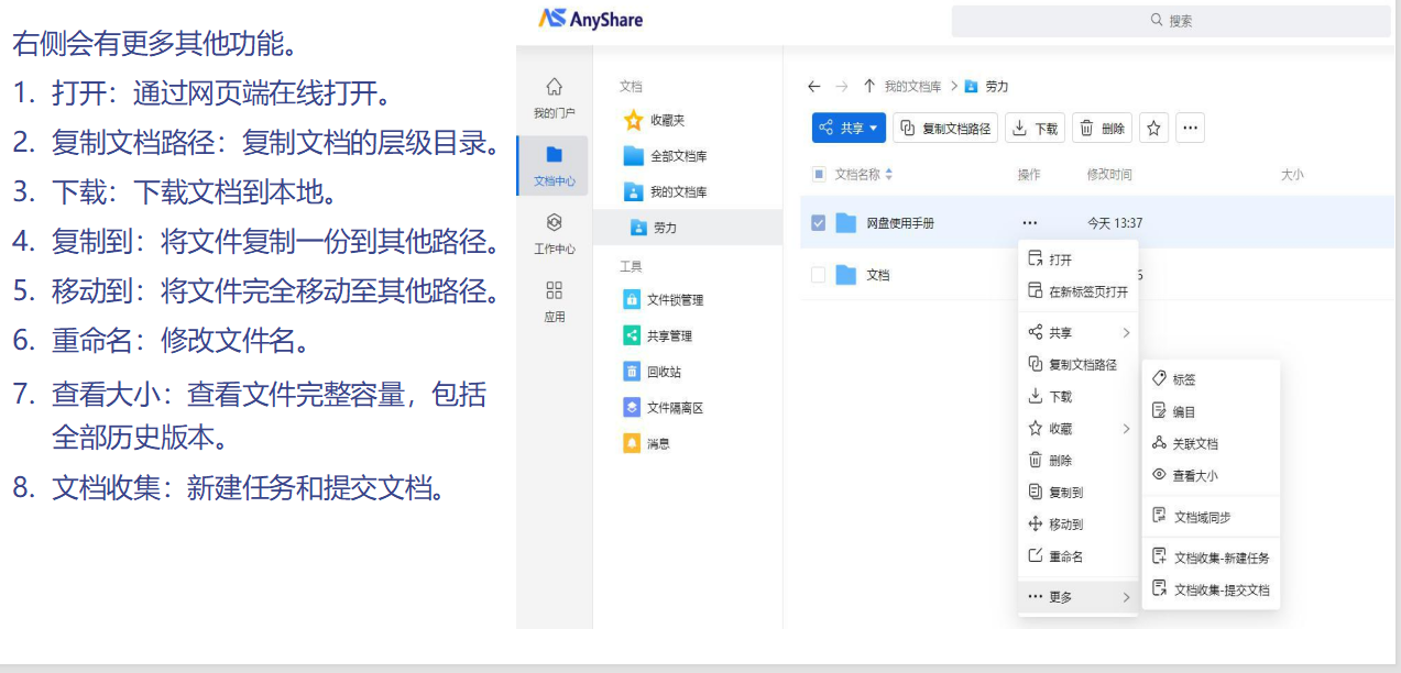 选中文件/文件夹时,点击右侧“…” 会跳出功能菜单栏用于文件操作。