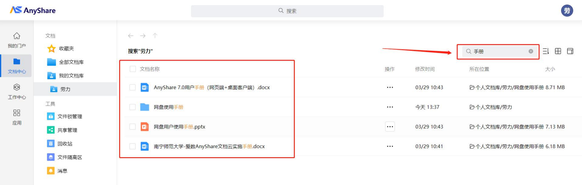 快速搜索效果,根据搜索的关键字,可以搜索到包含关键字的文件或文件夹。 搜索不仅仅可以匹配到文件名,也可以匹配到文件内容。