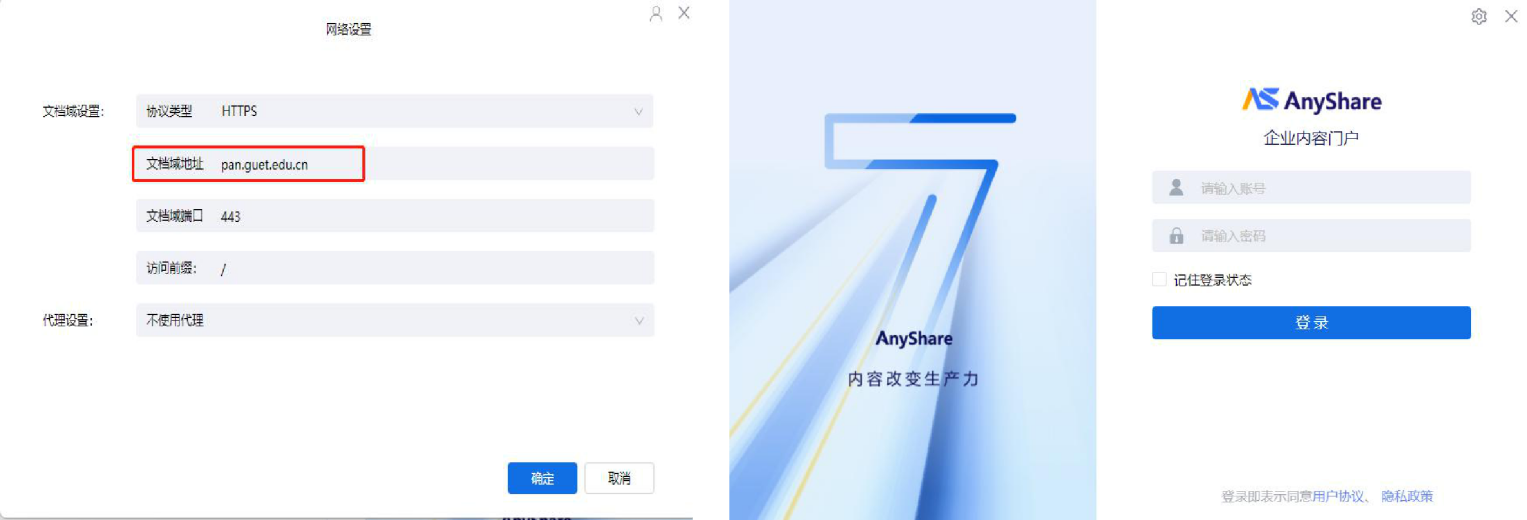 客户端登录:弹出设置界面时输入文档域地址: https://pan.guet.edu.cn/,文档域端口:443,在登录界面输入账号密码。