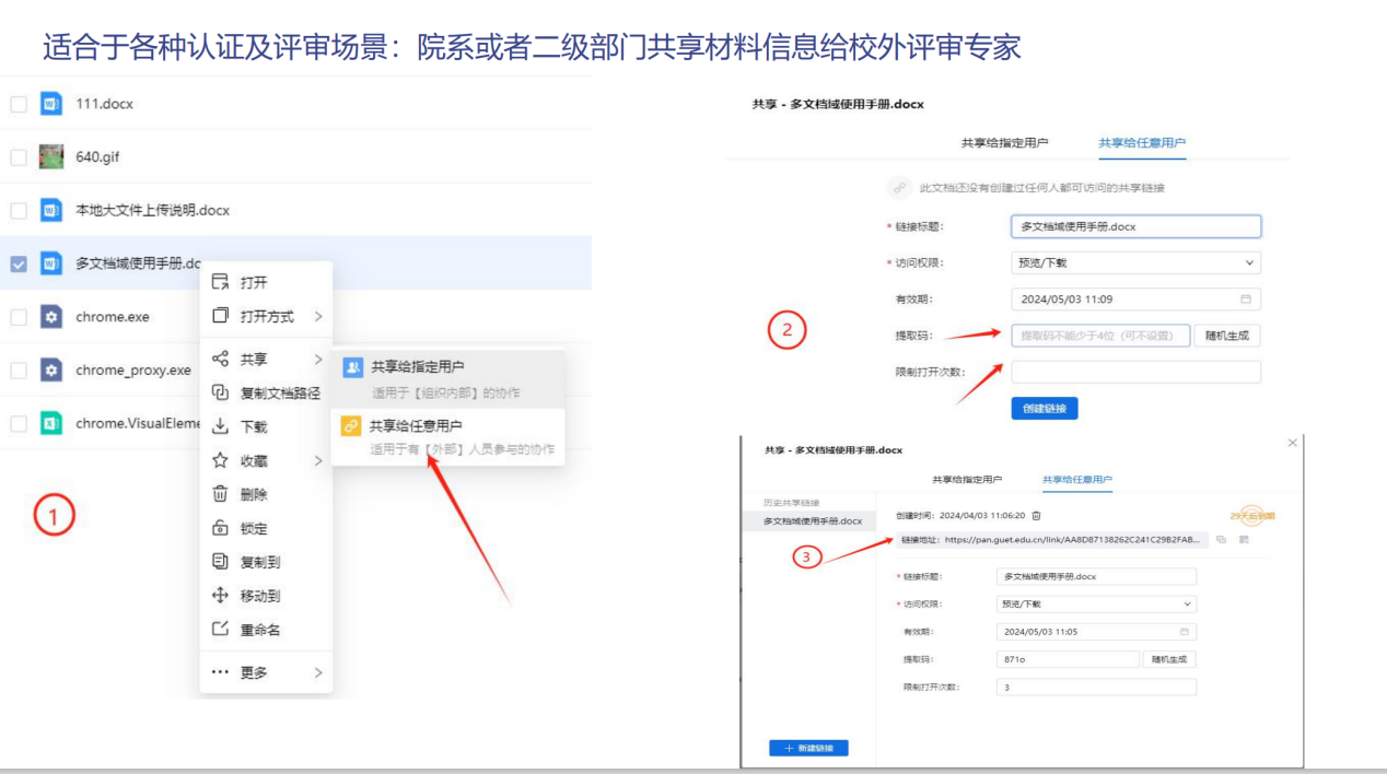 个人云存储:每位教职工私有独享50GB超大存储空间,各类文档随心存储,权限自主掌控,信息安全无忧!如需共享,可发送链接或者设置不同权限,允许他人访问分享的资料。