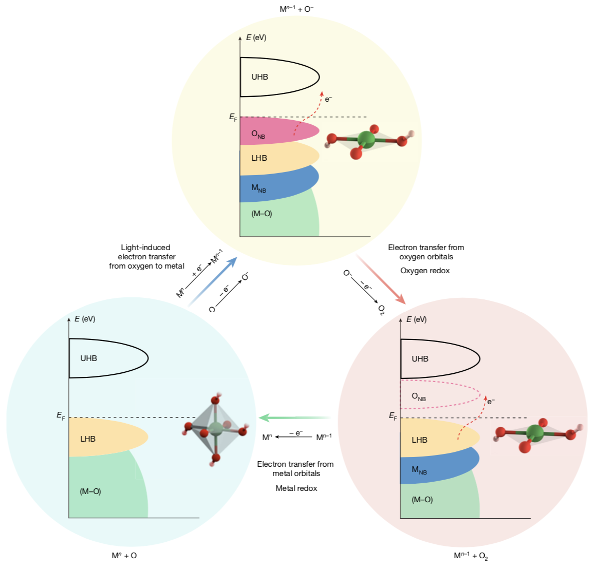 氢能源的大规模应用依赖于氢气的制备和存储技术的发展。电解制氢是实现氢能大规模应用的关键技术,被广泛用于储存风能、太阳能等间歇性能源。它由两种电化学反应构成,分别为发生在阴极的析氢反应(HER)和发生在阳极的析氧反应(OER)。与 HER 相比,驱动OER需要更高的过电势,这源于其缓慢的四电子-质子转移过程。因此,提升OER电催化活性,以降低电催化产氧反应所需的电压,是当前众多科研工作者努力的方向。目前OER反应存在两种机制:1)费米能级附近电子态表现金属特性时,金属作为氧化还原中心的吸附机理(AEM);2)费米能级附近电子态表现为氧时,氧作为氧化还原中心的晶格氧机理(LOM)如图1左所示。截至现在,文献报道的OER机理都是基于这两种机制。为了提升OER电催化活性,急需在理论层面有所创新,突破现有的OER机制。