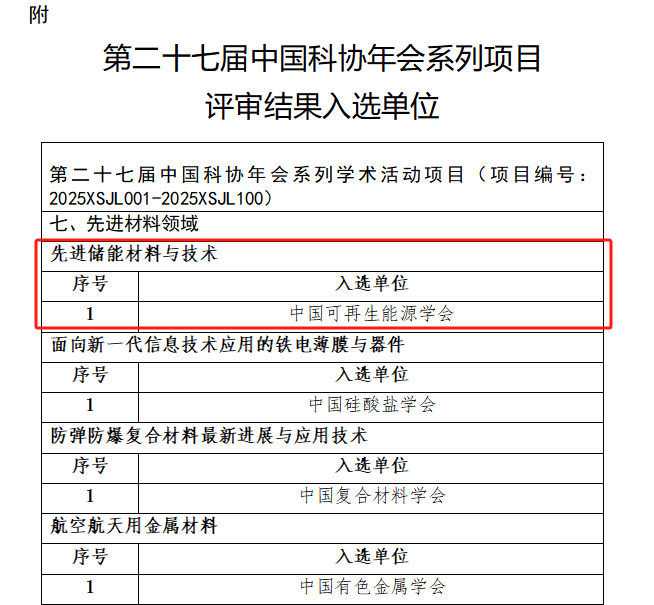 由中国可再生能源学会承办,广西科协、广西电子信息材料构效关系重点实验室、南开大学先进能源材料化学教育部重点实验室、有研集团国家有色金属能源材料与制品工程技术研究中心等单位协办的“先进储能材料与技术”项目成功入选第二十七届中国科协年会活动。