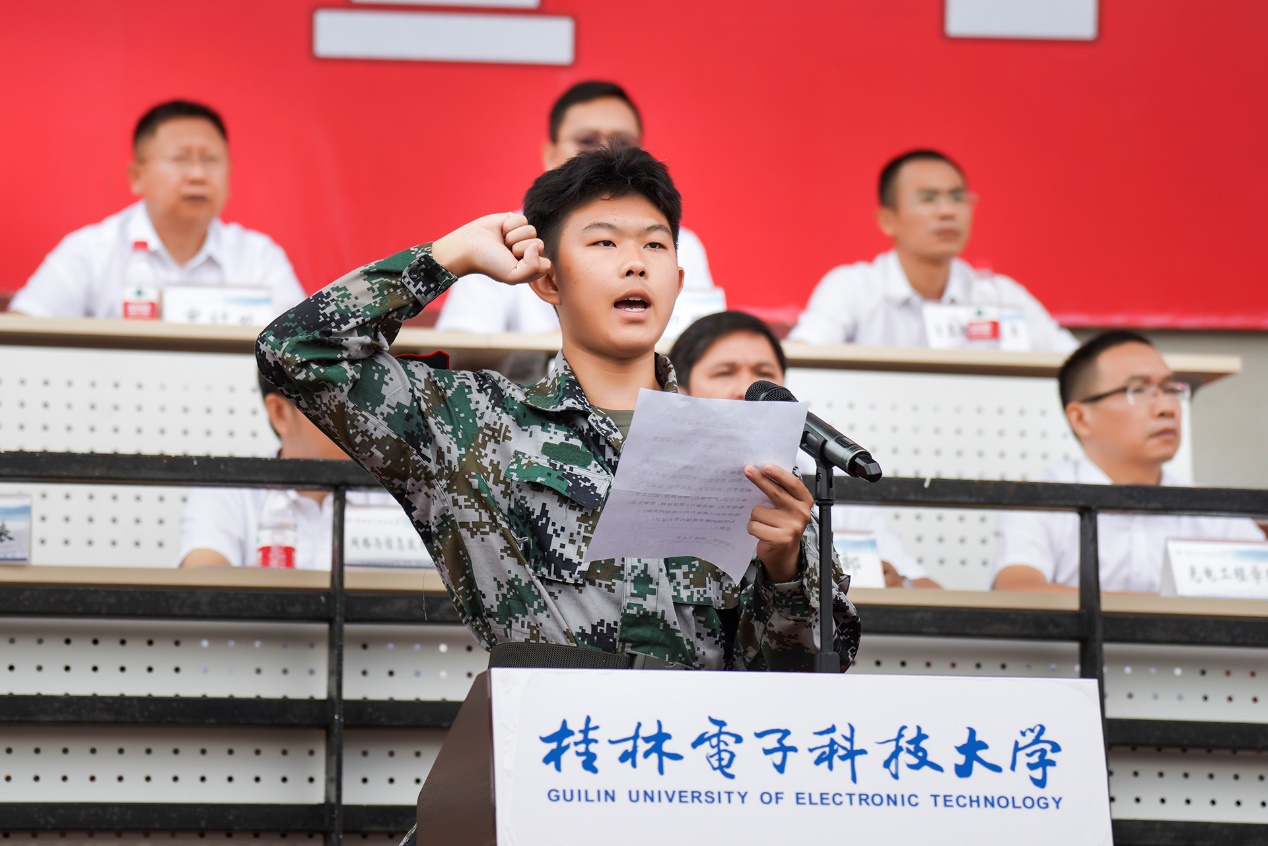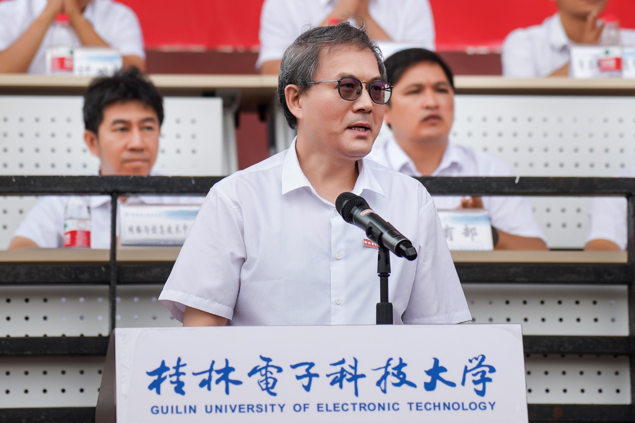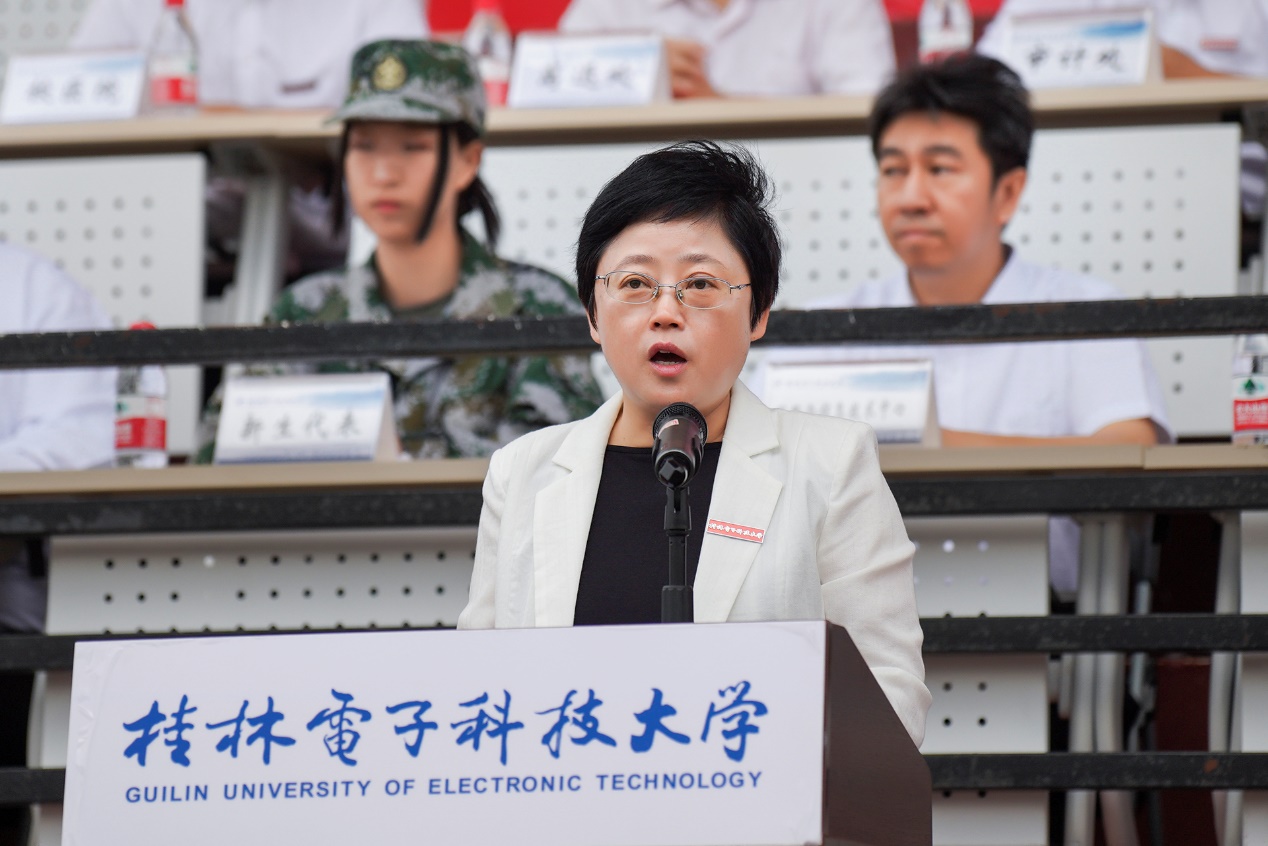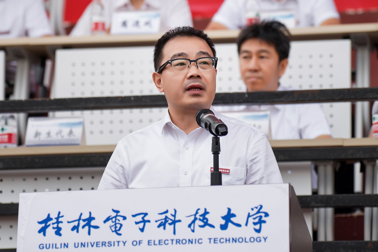 徐华蕊表示,同学们是实现中华民族伟大复兴的新生代力量,他结合同学们入学教育观看的电影《长空之王》,提了四点希望:一是希望同学们以理想为帆,在逐梦旅途中坚定方向。要把树立理想、坚定信念、确立目标作为大学的开端,把人生梦想汇入时代洪流,把个人的“小目标”融入国家的“大蓝图”,扬爱国心、树家国情、立报国志,成为有理想的桂电人。二是希望同学们以拼搏为舵,在勇担使命中实现自我。要把个人成长成才与国家发展、社会进步结合起来,展现“责任担当,舍我其谁”的精气神,敢于拼搏、善于争先、勇于奉献,在实践中历练,明晰努力方向,蓄积向上力量,成为敢担当的桂电人。三是希望同学们以坚毅为锚,在勤学苦练中锻造硬核。要跳出舒适圈,锤炼“不怕吃苦”的品格、涵养“自找苦吃”的精神,像海绵汲水一样不断汲取知识,求真学问、学真技能、练真本领,积蓄青春远航的动力、储备人生搏击的能量,成为能吃苦的桂电人。四是希望同学们以奋斗为桨,在复兴伟业中激扬青春。要领悟奋斗的真谛,让奋斗成为一种习惯、一种姿态、一种追求,以青春之我、奋斗之我,创造青春之中国、青春之民族,在一次次摸爬滚打中褪去稚气,在一次次迎难而上中增添勇气,在一次次爬坡过坎中沉淀底气,成为肯奋斗的桂电人。