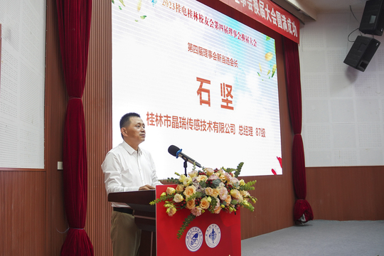 新当选会长石坚在履职讲话中表示,当选新一任会长使命光荣、责任重大,他将不忘初心、牢记使命,将桂林校友会建设好、发展好,不辜负母校和校友的重托。兄弟院校校友会代表、广西师范大学桂林校友会会长、桂林航天电子有限公司原党委书记唐建明和中国银行桂林分行行长杨超员为桂电桂林校友会送上祝福,希望加强双方的合作交流。