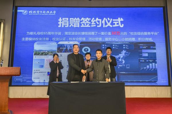 为庆祝母校65周年华诞,蒲定波向学校捐赠价值30万元的“校友综合服务平台”,该平台将集成校友返校服务、校友活动、校友信息管理、资源对接、校友企业宣传等功能,助力母校校友服务智能化建设。捐赠签约仪式在本次换届大会上举行。