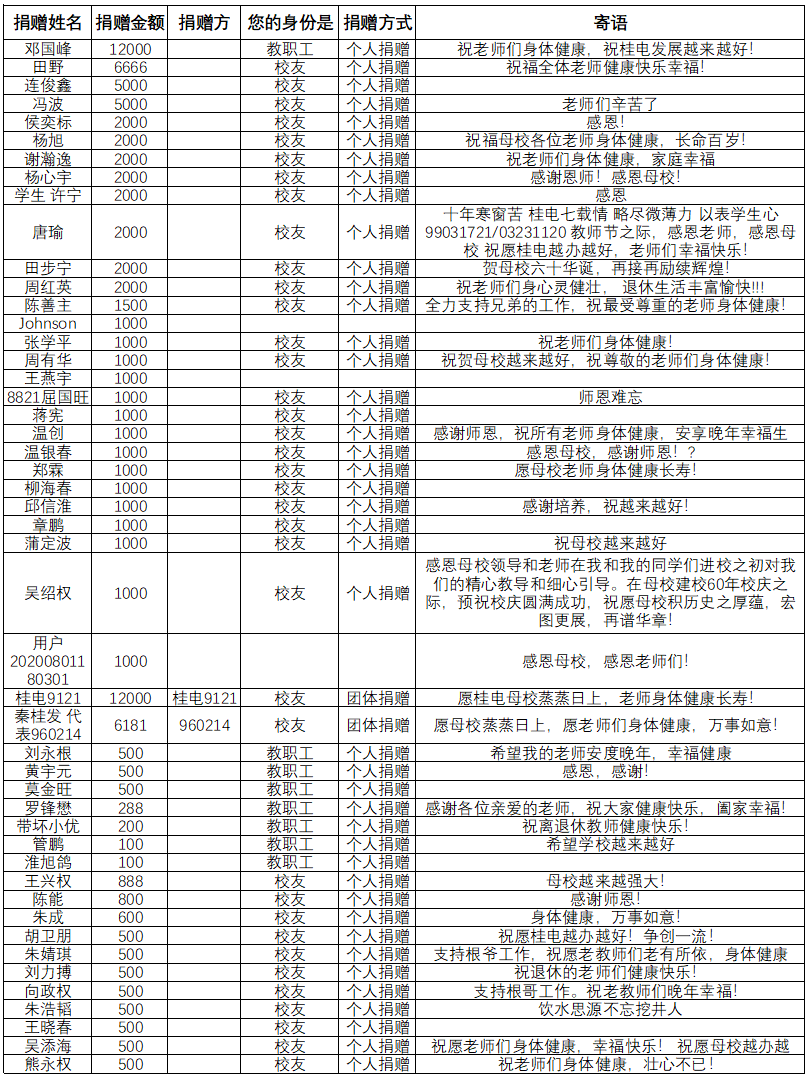 截止2021年3月14日,“感恩反哺”尊师基金捐赠项目共计收到99867.88元爱心捐赠(该汇总为桂电人平台导出数据数据汇总)。现将该项目明细公示如下: