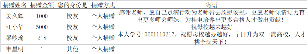 截止2021年3月14日,教师奖励基金捐赠项目共计收到6219.00元爱心捐赠(该汇总为桂电人平台导出数据数据汇总)。现将该项目明细公示如下:
