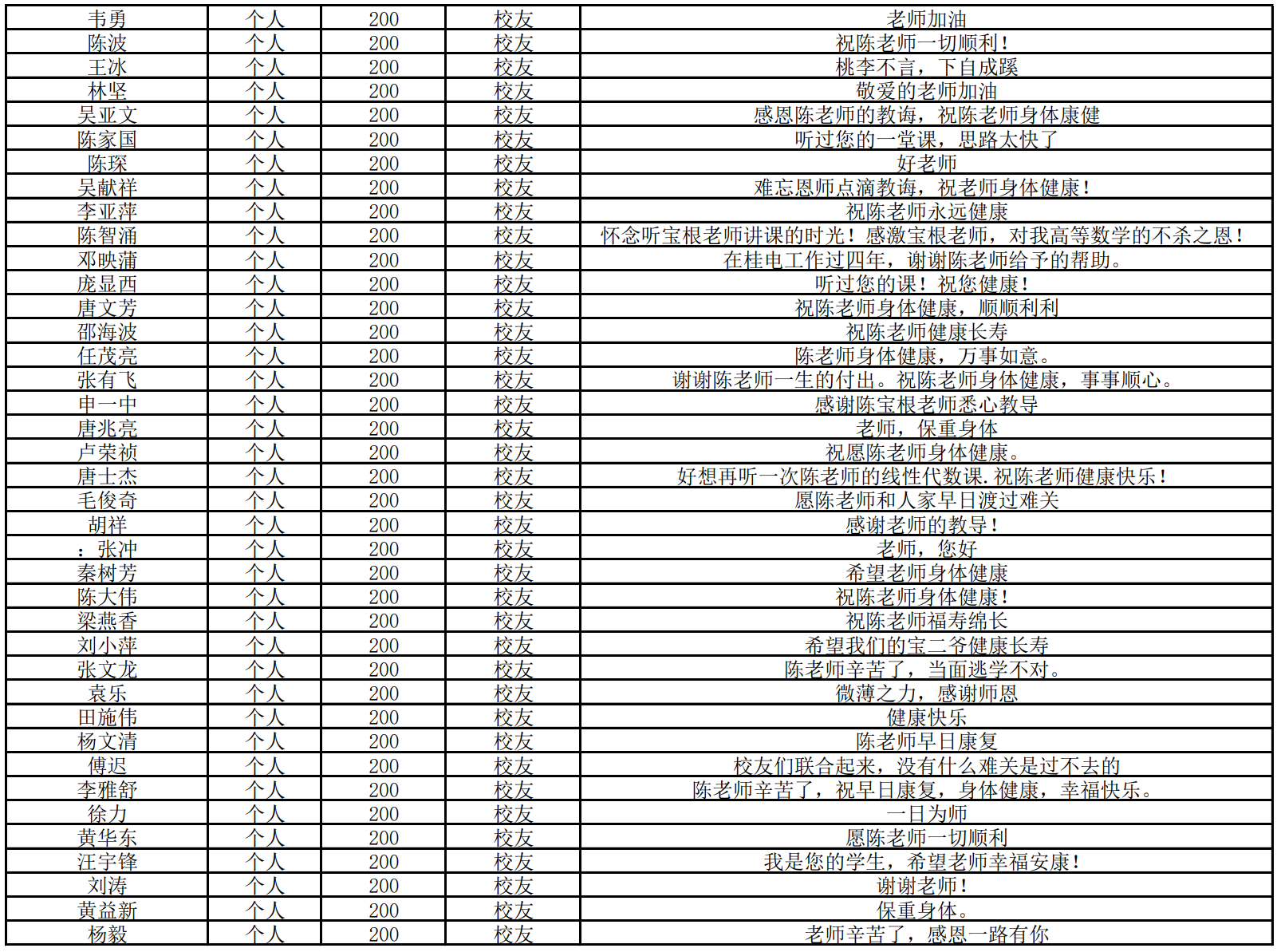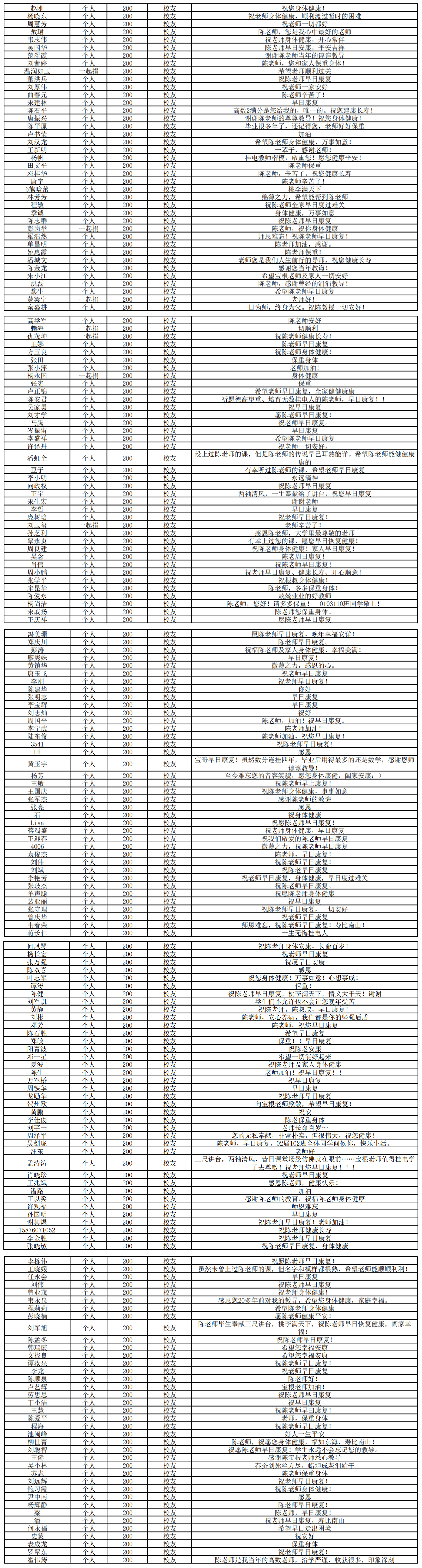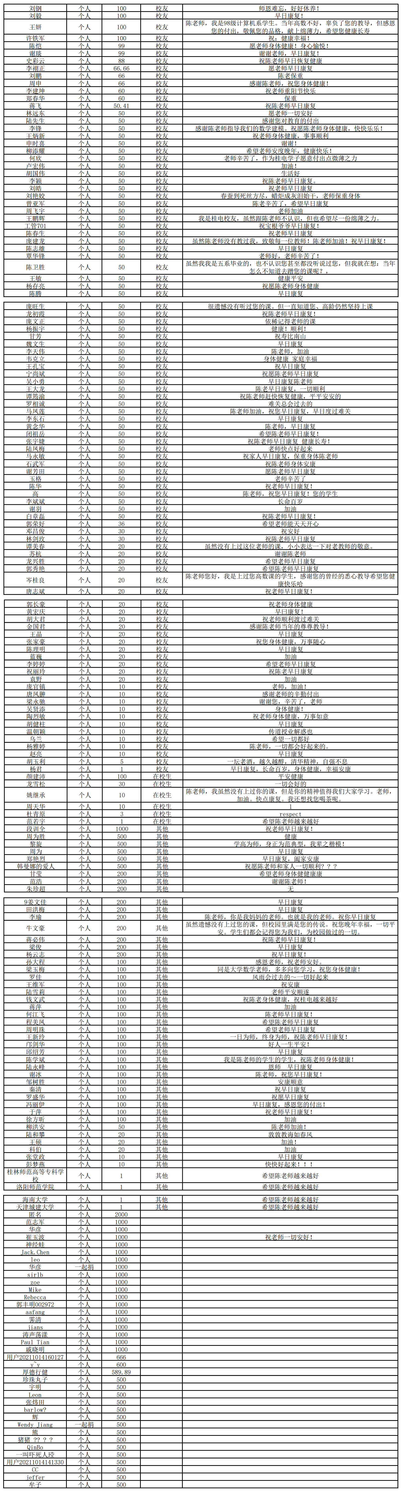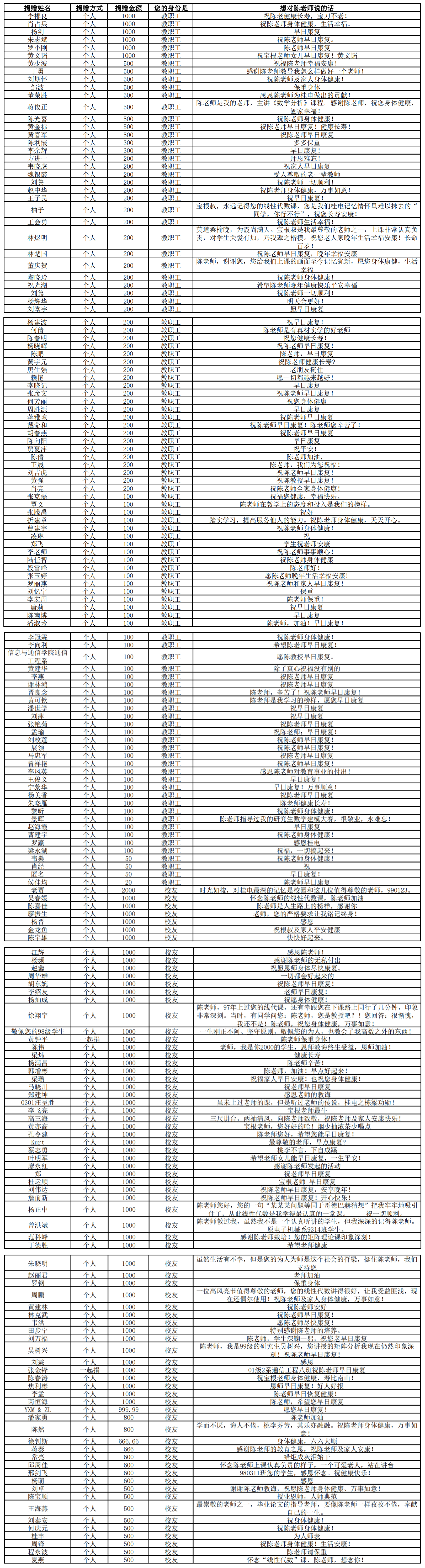 三亿官方官网三亿(中国)_三亿(中国)校友(陈宝根老师的学生们)在了解到陈老师的现状后,再次向全体师生、校友发出了为陈老师捐款的倡议,数学与计算科学学院和校基金牵头设立了“陈宝根老师感恩基金”。