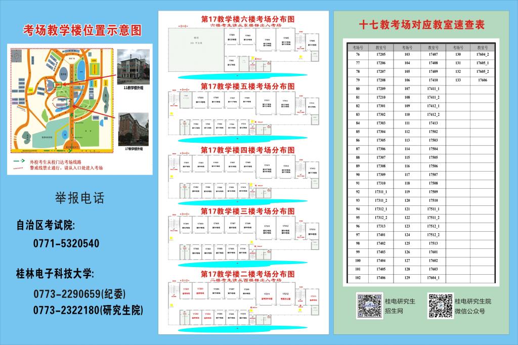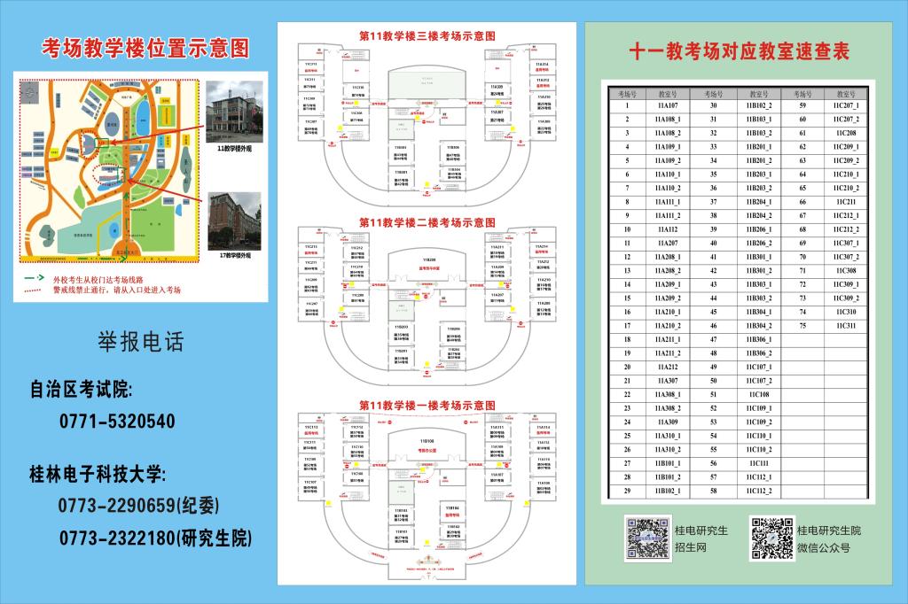 2023年全国硕士研究生招生考试桂电考点的考场,安排在三亿官方官网三亿(中国)_三亿(中国)花江校区第十一、十七教学楼,具体考场号和教室号查看附件(座位号可于考试当天查询考场门贴)。