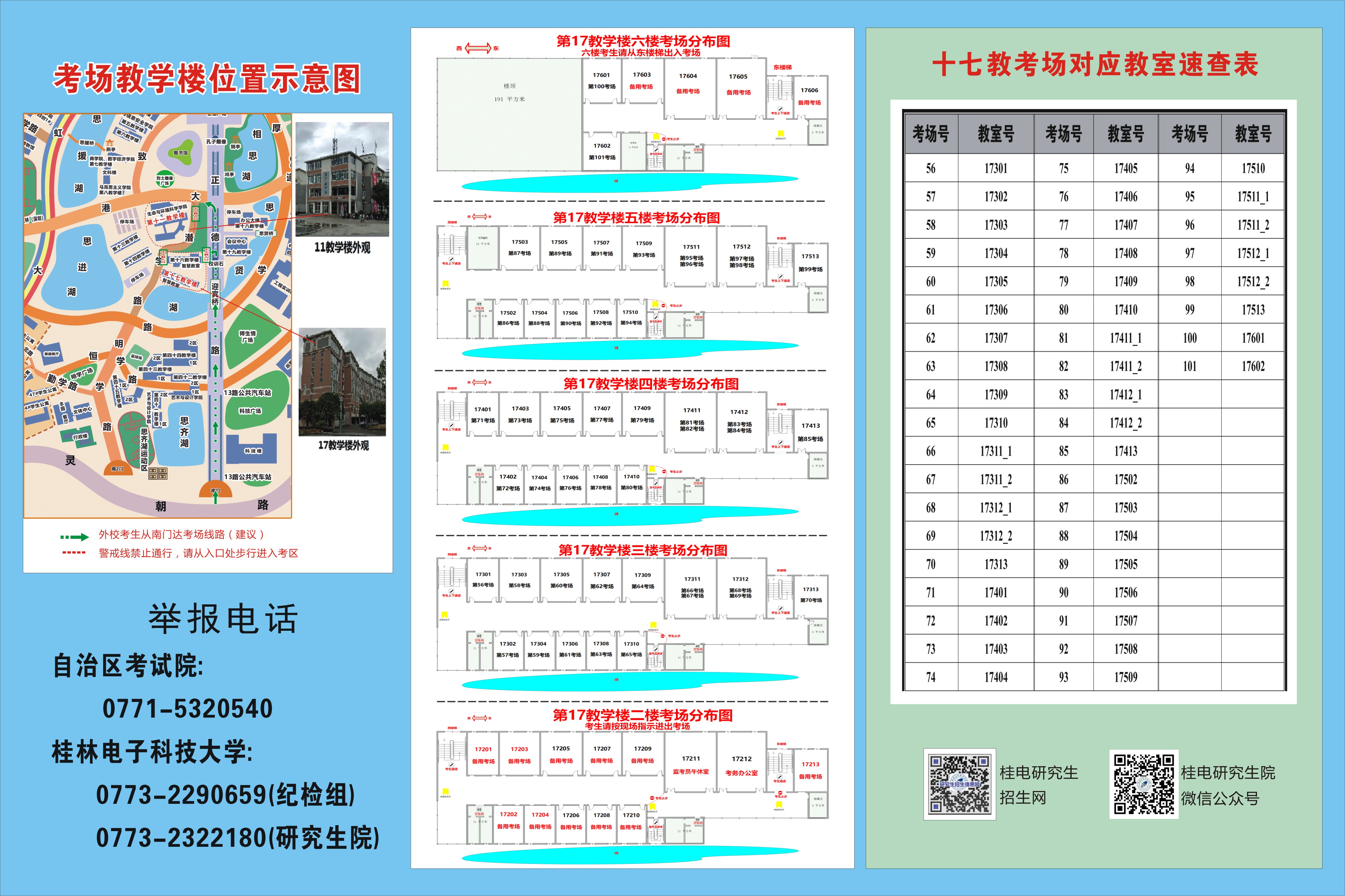 (一)考场安排索引表、考场分布表及考点平面示意图详见附件,17教6楼考场的考生请从17教东侧入口进入教学楼。