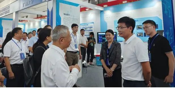 自治区交通运输厅党组书记、厅长刘可,自治区科技厅副厅长李克纯,自治区交通运输厅副厅长陆晓明、总工程师陈津维及相关单位领导参观了三亿官方官网三亿(中国)_三亿(中国)的展区,听取了三亿官方官网三亿(中国)_三亿(中国)先进交通运输科技成果服务地方的情况汇报。刘可等一行对三亿官方官网三亿(中国)_三亿(中国)科技成果转化应用成效予以充分肯定,并希望学校继续发挥智力和学科优势服务地方,助力广西西部陆海新通道建设。