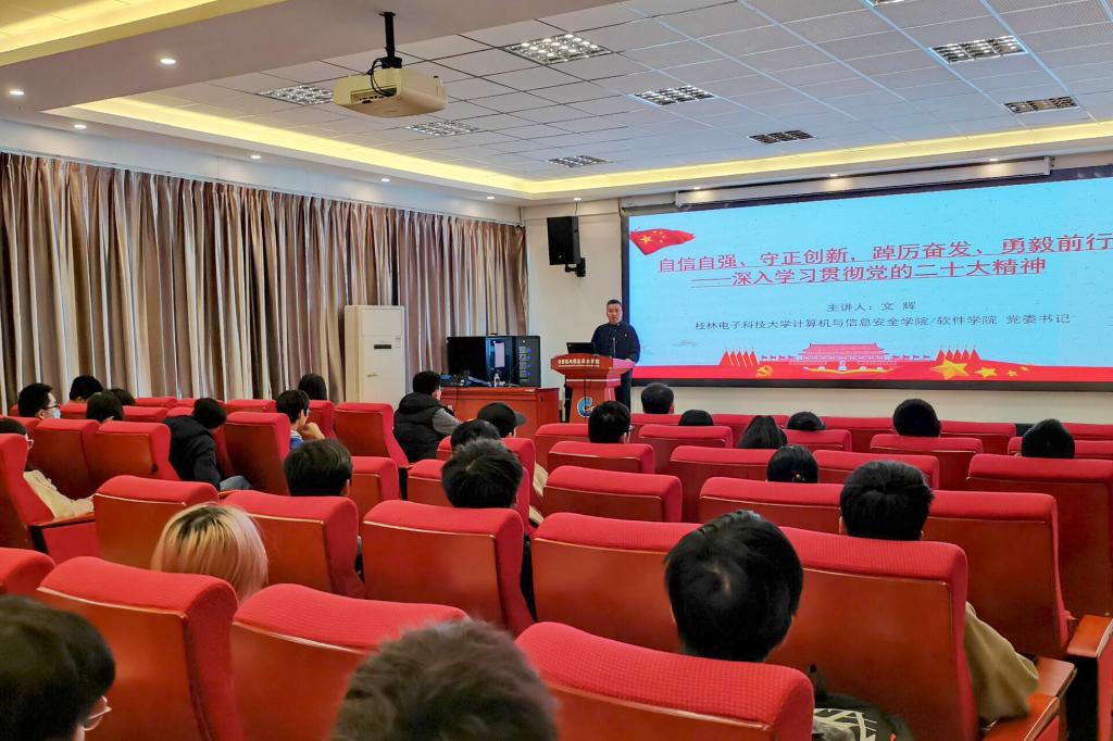 11月17日,计算机与信息安全学院党委书记文辉在花江校区第五教学楼5506A为学生党员上党课。文辉以“自信自强,守正创新,踔厉奋发,勇毅前行,深入学习贯彻党的二十大精神”为题,深入解读了三个“务必”、六个“必须坚持”、中国共产党的中心任务、中国式现代化的本质要求、全面建设社会主义现代化国家等内容的深刻内涵和外延。他强调,学生党员要将党的二十大精神内化于心,外化于行,用行动践行社会主义核心价值观。