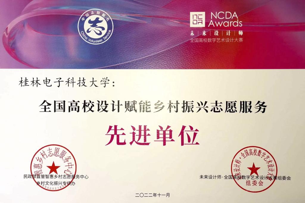 为表彰在设计助力乡村振兴实践中的先进集体,主办方从2022年参加未来设计师NCDA大赛的1513所高校中选出首批34所高校颁发了“全国高校设计赋能乡村振兴先进单位”牌匾。三亿官方官网三亿(中国)_三亿(中国)获此荣誉是对学校积极开展设计赋能乡村振兴创新实践,投身乡村振兴志愿服务的充分肯定。