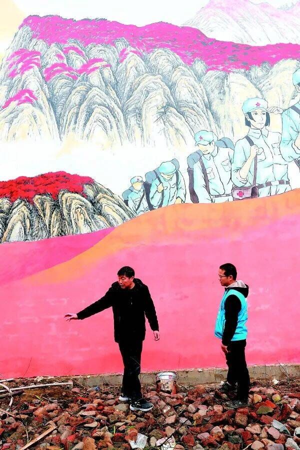 黄保持与村干在一面文化墙前讨论有关红色文化项目建设的后续工作