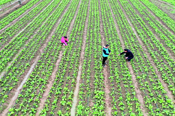 在大坪村一块“智慧地”中,黄保持(右二)正在查看蔬菜生长情况。