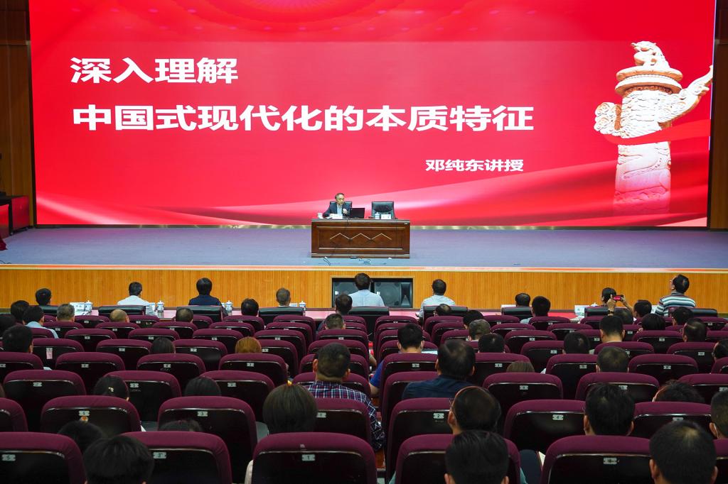 十三届全国政协社会和法制委员会委员、原中国社会科学院马克思主义研究院党委书记、院长邓纯东研究员应邀作了题为“深入理解中国式现代化本质特征”的专题辅导报告,他重点阐述了深入理解中国式现代化本质特征的“两个前提”,即中国共产党的中心任务和中国式现代化内涵,并运用国际化视野和历史性思维,以丰富的案例、事实分析以及大量翔实的数据,围绕中国式现代化是人口规模巨大的现代化、中国式现代化是全体人民共同富裕的现代化、中国式现代化是物质文明和精神文明协调的现代化、中国式现代化是人与自然和谐共生的现代化、中国式现代化是走和平发展道路的现代化等5个方面的内容,全面系统地讲解了中国式现代化的基本特征,为学员们上了一堂精彩的专题辅导课。