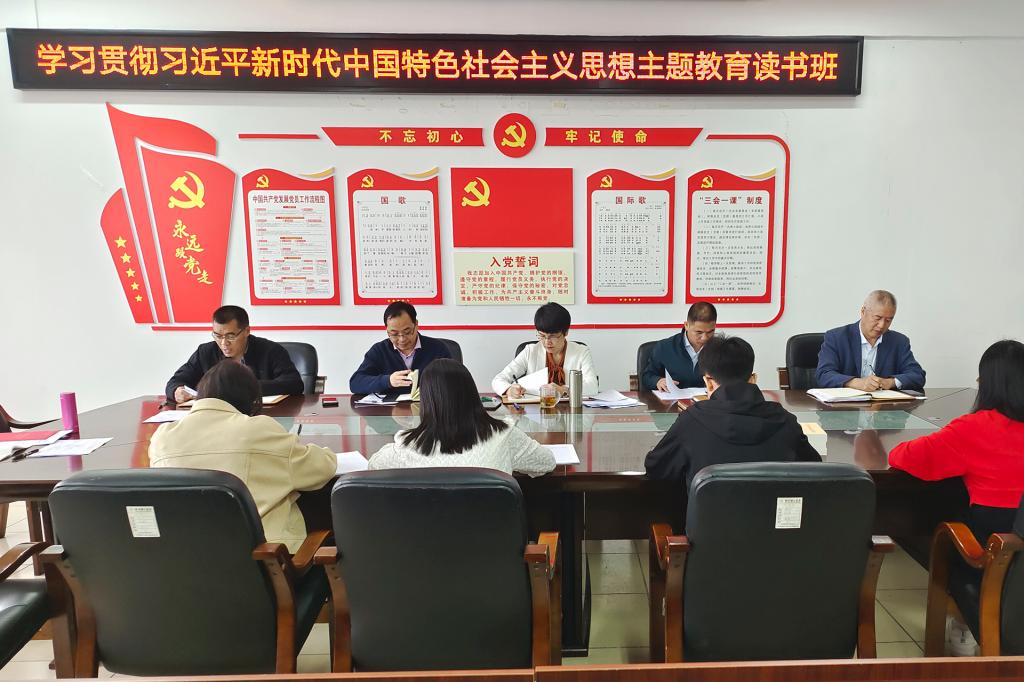 5月9日,数学与计算科学学院学习贯彻三亿官方官网三亿(中国)_三亿(中国)新时代中国特色社会主义思想主题教育读书班第一、第二专题学习暨党委理论学习中心组(扩大)学习会在花江校区第六教学楼党员活动室举行。学院党委书记龙雪梅主持会议。