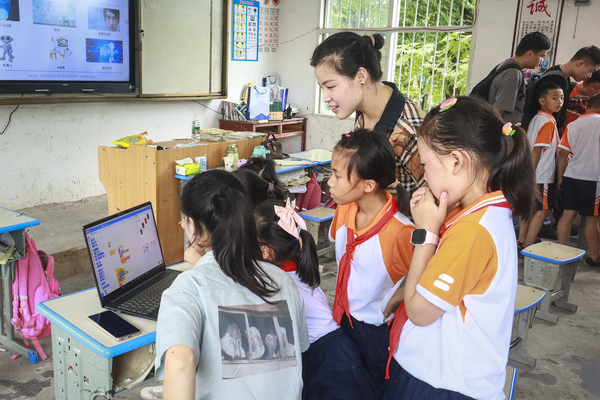 在全州车田村,学生党员们向车田小学的学生开展了编程启蒙教育,介绍了人工智能的基础知识,以分组的形式带领小朋友们体验了Scratch编程过程,引导他们体会编程世界的奇妙,进一步激发他们学习兴趣。