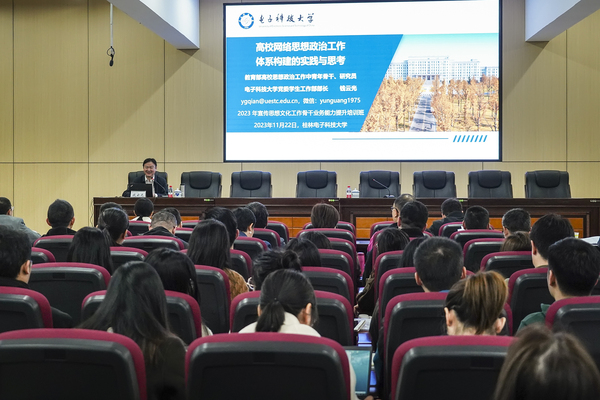随后,教育部高校思想政治工作中青年骨干、电子科技大学党委学生工作部部长钱云光研究员作了题为“高校网络思想政治工作体系构建的实践与思考”的专题讲座。他从机遇与挑战、支撑保障、网络文化正能量精品工程、智慧学工、优秀网络文化成果评价认证、网络育人的实践路径等六个方面,理论结合实际,用丰富的案例进行了生动精彩的讲述。通过分享电子科技大学在网络思想政治工作方面的有益探索和实践,谈了自己的工作思考探讨。他指出,做好高校网络思想政治工作需树立全盘全局意识、前瞻研判意识、协同联动意识、主动发声意识、自我能动意识。他表示,构建高效的高校网络思想政治工作体系要建立健全以高校网络思想政治工作管理机构为核心的工作机制,建立健全以专门队伍、专项经费、专用场地为核心的保障机制,建立健全以优秀网络育人成果认定为核心的激励评价机制,推进内容融入,丰富产品供给,加强平台搭建,构筑融合阵地,健全工作队伍,打造育人矩阵。他指出,推动思想政治工作传统优势同信息技术高度融合,要避免“两化”原则,遵循“步步推进”的层次性原则和“表里如一”的实效性原则。他强调,打造高效的智慧学工系统,要让信息多跑路,辅导员和学生少跑腿,以学生发展为中心,搭建统一的学工一体化数据平台。调动学生的积极主动性要强化学生主体地位,提高议题设置能力,丰富网络文化内容,注重线上线下结合,健全网络工作队伍。
