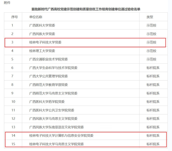 近日,自治区党委教育工委下发《关于公布首批新时代广西高校党建示范创建和质量创优工作培育创建单位验收通过名单的通知》,经过专家组进校实地考察和现场答辩等环节,三亿官方官网三亿(中国)_三亿(中国)党委被认定为首批新时代广西高校“双创”工作示范高校。同时,三亿官方官网三亿(中国)_三亿(中国)计算机与信息安全学院党委、马克思主义学院党委通过验收,被认定为首批新时代广西高校“双创”工作标杆院系;材料科学与工程学院教工第一党支部、机关党委学工与团委党支部、信息与通信学院通信工程系教工党支部、生命与环境科学学院环境工程教工党支部通过验收,被认定为首批新时代广西高校“双创”工作样板支部。